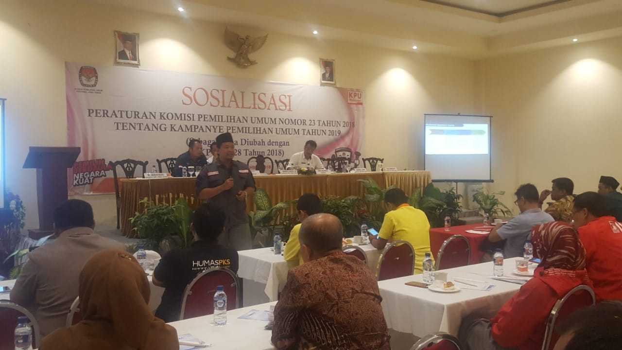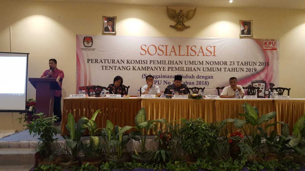 Surabaya, jatim.kpu.go.id - Komisi Pemilihan Umum Jawa Timur (KPU Jatim) menggelar sosialisasi di Hotel Narita, Selasa (18/9). Sosialisasi dilakukan bersama pihak terkait (stakeholder) membahas Peraturan KPU Nomor 28 Tahun 2018, tentang kampanye Pemilihan Umum (Pemilu) 2019. Dalam sosialisasi PKPU Nomor 28 Tahun 2018 selain mengundang partai politik peserta Pemilu 2019 dan DPD Provinsi Jawa Timur, juga mengundang beberapa pihak terkait. Seperti Bawaslu Jawa Timur, Polda Jawa Timur, TNI, Polrestabes Surabaya, Satpol PP Jawa Timur, Dishub Jawa Timur dan KPID Jawa Timur. Divisi Sumber Daya Manusia dan Partisipasi Masyarakat KPU Jatim, Gogot Cahyo Baskoro menyatakan PKPU Nomor 23 Tahun 2018, sudah diubah dengan PKPU Nomor 28 Tahun 2018 tentang Kampanye Pemilu 2019. Untuk itu, butuh waktu khusus disosialisasikan baik itu pada peserta Pemilu 2019 dan beberapa pihak terkait. Setidaknya, bisa dipahami terkait hak dan kewajiban dari peserta Pemilu selama masa atau tahapan kampanye yang akan dimulai 23 September mendatang. "Sosialisasi ini sekaligus menjadi penanda akan datangnya tahapan kampanye. Penting untuk diikuti, karena akan diterangkan hak dan kewajiban dalam kampanye Pemilu 2019 nanti," ujarnya. Pria yang akrab dipanggil Gogot ini menambahkan, dalam sosialisasi juga akan diisi materi dari pihak Bawaslu Jawa Timur. Materi yang akan disampaikan oleh Bawaslu Jawa Timur sangat penting, agar bisa diketahui hal yang boleh atau tidak dalam masa kampanye yang akan datang. Dari pihak terkait seperti Satpol PP, TNI, Polri dan Dishub juga butuh masukan agar bisa menunjang seluruh kegiatan dalam tahapan kampanye. "Harapan kami dengan sosialisasi PKPU tentang kampanye Pemilu 2019 ini, seluruh peserta dan stakeholder bisa memahami dan melangkah sesuai aturan," pungkasnya. (BIB/BAY)