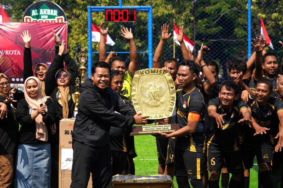 Surabaya, jatim.kpu.go.id- Hari Ulang Tahun (HUT) Kemerdekaan ke-80 Republik Indonesia dilaksanakan dengan semarak dan penuh semangat di satuan kerja Komisi Pemilihan Umum Provinsi Jawa Timur (KPU Jatim). Hal ini nampak dari mulai awal peringatan Selasa, 12 Agustus 2025 sampai dengan hari penutupan Kamis, 14 Agustus 2025. Ketua KPU Jatim, Aang Kunaifi berharap melalui pelaksanaan perayaan HUT Kemerdekaan Indonesia dapat meningkatkan jiwa nasionalisme keluarga besar KPU Jatim sebagai bangsa Indonesia. “Selain itu, melalui momen peringatan ini diharapkan pula dapat meningkatkan kinerja di posisi masing-masing staf sekretariat,” tutur Aang saat membuka peringatan pada 12 Agustus 2025. Hari pertama momen peringatan HUT RI, seluruh jajaran KPU Jatim mengikuti lomba tenis meja dan catur. Hasil akhir dari kedua perlombaan menunjukkan pemenang pertama lomba tenis meja yakni subbag Parmas. Sementara pemenang pertama lomba catur diperoleh subbag Hukum. Nah, untuk hari kedua peringatan HUT RI, menurut Ketua KPU Jatim ada lomba Cantol Topi, Makan Krupuk, Estafet Tepung, serta Lomba Tampah Bola. “Mereka nampak riang, saling bekerja sama, dan mengikuti dengan penuh semangat,” kata Ketua KPU Jatim saat dimintai keterangan pada 13 Agustus 2025. Memasuki hari pungkasan peringatan HUT RI tanggal 14 Agustus 2025, diadakan babak penyisihan, semi final serta final Mini Soccer KPU Jatim bersama KPU Kabupaten/Kota di Jawa Timur. Kegiatan bertempat di lapangan mini soccer, Jl. Masjid Al-Akbar Timur Nomor 1 Pagesangan, Surabaya. Dalam permainan Mini Soccer ini, hemat Aang penting bagi seluruh peserta untuk menjaga keselamatan diri, satu tim, serta tim lainnya juga.“Dan harapannya peserta membawa nuansa kegembiraan serta semangat dalam permainan,” katanya pada 14 Agustus 2025. Dukungan dari para supporter melalui yel-yel dengan tabuhan musik menambah semarak permainan ini. Lebih lanjut, hasil akhir permainan diperoleh juara 1 disabet KPU Kabupaten Gresik, diposisi kedua berhasil diraih KPU Kabupaten Tulungagung. Dan di posisi ketiga, ditempati KPU Kota Madiun.*** (AA)