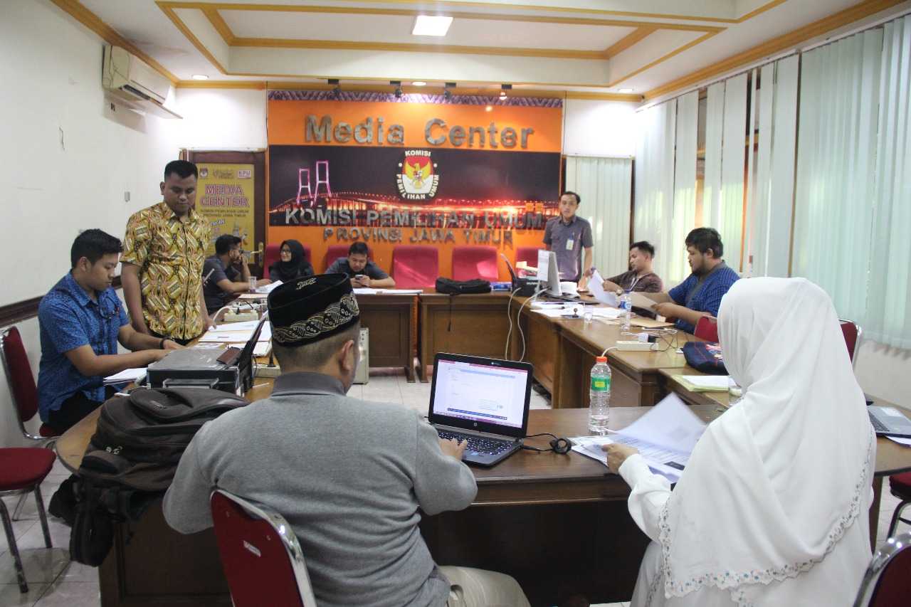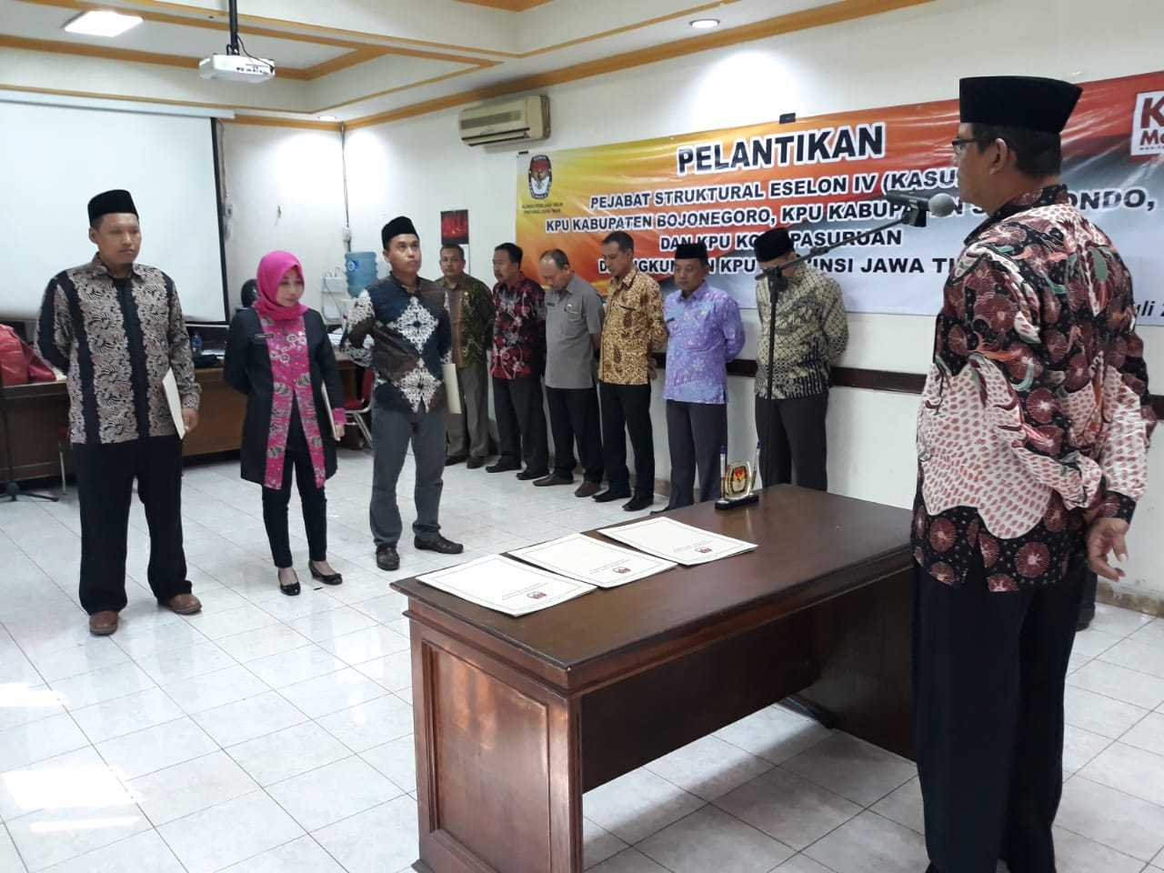 Surabaya, jatim.kpu.go.id – Tiga orang pejabat struktural eselon IV.a atau setara dengan jabatan Kepala Sub Bagian (Kassubag) ditingkat Kabupaten/Kota, dilantik di ruang media center Komisi Pemilihan Umum (KPU) Provinsi Jawa Timur, Rabu (11/7). Adapun prosesi pelantikan dilakukan oleh Sekretaris KPU Provinsi Jawa Timur Eberta Kawima. Hadir dalam acara pelantikan Ketua KPU Provinsi Jawa Timur Eko Sasmito, beserta Kepala Bagian (Kabag) Program Data dan Sumber Daya Manusia KPU Provinsi Jawa Timur Suharto dan seluruh jajaran Kassubag. Adapun yang dilantik adalah Ganda Widyo Prabowo sebagai Pj. Kassubag Hukum KPU Kota Pasuruan, Fairul Laily sebagai Kassubag Umum KPU Kabupaten Situbondo dan Andrie Susanto sebagai Pj. Kassubag Hukum KPU Kabupaten Bojonegoro. Sekretaris KPU Provinsi Jawa Timur Eberta Kawima menyatakan tahapan yang berjalan saat ini saling berhimpitan, sehingga butuh kerja yang sungguh-sungguh. Atas dasar tahapan tersebut, dia berharap pada Kassubag yang sudah dilantik untuk segera menyesuaikan diri dengan ritme kerja yang sudah berjalan. Pria yang akrab dipanggil Wima ini juga meminta agar Kassubag yang sudah dilantik, untuk segera menyesuaikan diri dengan tugasnya. Terlebih, bisa segera beradaptasi dengan tahapan Pemilu tahun 2019 yang saat ini sudah berjalan dan itu harus segera dikoordinasikan dengan seluruh jajarannya. “Jam kerja kita bukan kerja normal kantoran, kadang sampai larut malam dan itu harus siap untuk masuk di luar jam kerja,” ujarnya. (MC – BIB/BAY)