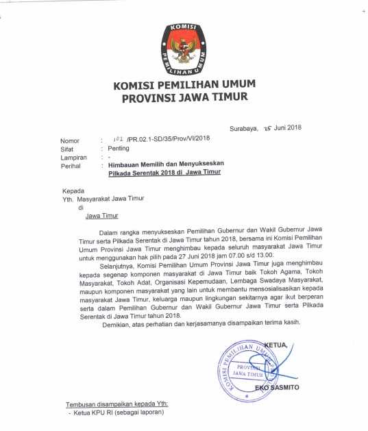 Surabaya, jatim.kpu.go.id – Komisi Pemilihan Umum (KPU) Provinsi Jawa Timur mengimbau agar seluruh lapisan masyarakat yang ada di Jawa Timur, untuk menggunakan hak pilih dan menyukseskan Pemilihan Kepala Daerah (Pilkada) serentak 2018. Himbauan itu disampaikan langsung secara tertulis, tertuang dalam surat resmi. Dalam yang ditanda tangani langsung oleh Ketua KPU Provinsi Jawa Timur Eko Sasmito tersebut, menghimbau agar seluruh lapisan masyarakat untuk menggunakan hak pilihnya dalam Pilkada serentak Rabu (27/6) besok. Caranya, dengan datang langsung ke Tempat Pemungutan Suara (TPS), mulai pukul 07.00 – 13.00 WIB. “Dalam rangka menyukseskan Pilgub Jawa Timur dan Pilkada serentak 2018, kami mengimbau kepada seluruh masyarakat Jawa Timur untuk menggunakan hak pilihnya,” ujarnya. Pria yang akrab dipanggil Eko ini tidak hanya menghimbau masyarakat Jawa Timur datang ke TPS menggunakan hak pilih. Dia juga menghimbau kepada segenap komponen masyarakat, baik itu tokoh agama, tokoh adat, tokoh masyarakat, organisasi kepemudaan, lembaga swadaya masyarakat maupun komponen masyarakat yang lain untuk membantu mensosialisasikan pelaksanaan pencoblosan. “Sosialisasikan kepada keluarga maupun lingkungan sekitar, agar ikut berperan serta dalam Pilgub Jatim dan Pilkada serentak 2018,” pungkasnya. (MC – BIB/BAY)