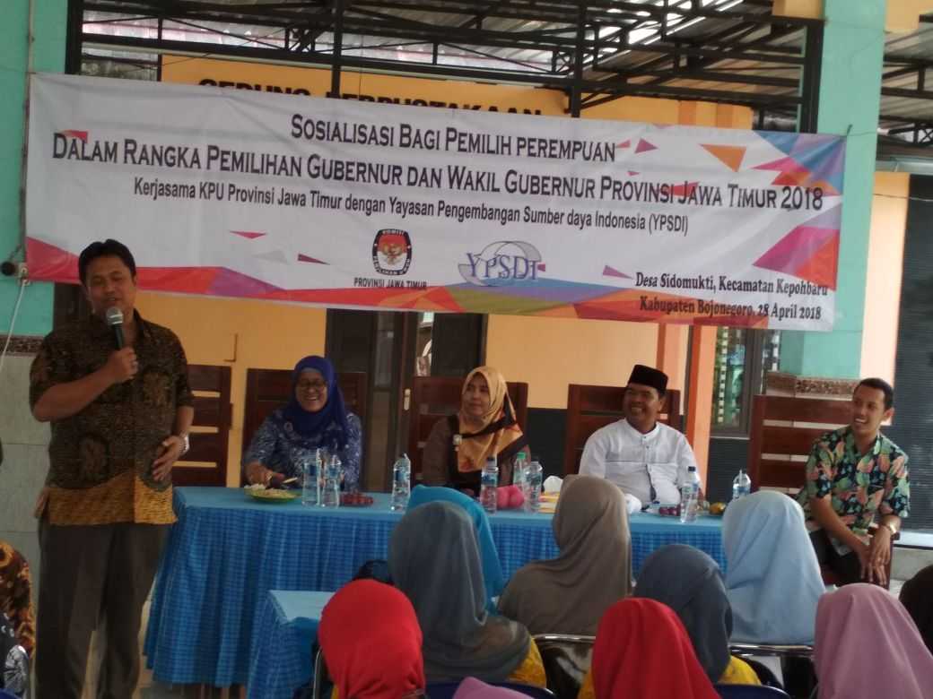 Bojonegoro, jatim.kpu.go.id– Ketua Komisi Pemilihan Umum Jawa Timur (KPU Jatim), Eko Sasmito, terus gencar melakukan sosialiasi dengan berbagai segmen melalui metode tatap muka. Terkini, sosialisasi Pemilihan Gubernur dan Wakil Gubernur Jawa Timur (Pilgub Jatim) dengan segmen pemilih perempuan digelar di Kabupaten Bojonegoro. Dalam sosialisasi yang digelar bersama Yayasan Pengembangan Sumber Daya Indonesia (YPSDI) tersebut dilaksanakan di Balai Desa Sidomukti, Kecamatan Kepohbaru Bojonegoro, Sabtu (28/4). Pria yang akrab dipanggil Eko tersebut, juga didampingi dua narasumber lain yang kompeten dalam bidang hukum dan kepemiluan. Keduanya adalah dosen dari Fakultas Hukum Universitas Trunojoyo Madura (UTM), Devi Rahayu dan Nunuk Nuswandari (pakar hukum UTM). Ketua KPU Jatim, Eko Sasmito dalam paparan materinya menyatakan Pilgub pada dasarnya sama dengan Pemilihan Kepala Desa (Pilkades). Beberapa kesamaannya antara lain, ada peserta atau calonnya, serta pemilih dan surat suara. Cuma menurutnya, yang berbeda hanya ruang lingkupnya saja. “Pilkades hanya setingkat desa sedangkan Pilgub se-Jatim. Intinya sama-sama memilih pemimpin yang baik,” ujarnya. Eko menambahkan, dalam Pilgub Jawa Timur 27 Juni 2018 mendatang juga harus memilih calon pemimpin yang baik. Bagaimana cara memilih pemimpin yang baik, di antaranya harus paham dengan pasangan calon yang akan dipilih. Pemilih harus melihat rekam jejak serta paham visi dan misi paslon. Bila kedua paslon dinilai memiliki rekam jejak yang jelekmenurut Eko, masyarakat harus tetap milih dengan cara memilih kejelekannya yang paling sedikit dan jangan sampai tidak menggunakan hak pilih atau Golput. Terlebih memilih dengan dasar pemberian uang, juga diharap jangan sampai dilakukan. “Diharapkan Bapak/ Ibu tidak menerima uang politik dari paslon, karena baik yang pemberi dan penerima akan diberi sanksi hukuman penjara,” tegasnya. Sementara itu, Dosen Fakultas Hukum UTM, Devi Rahayu menyampaikan bahwa dunia politik sering mengabaikan kebutuhan dan aspirasi perempuan yang dianggap wilayah privat, bukan formal. Maka, perempuan perlu berpolitik untuk membawa isu perempuan dalam pengambilan keputusan yang berdampak luas bagi masyarakat. “Makna politik bagi perempuan yakni sebagai proses pengambilan keputusan yang bisa terjadi dimana saja dan kapan saja. Kedudukan perempuan dalam politik sama dengan laki-laki, maka berpartisipasilah secara aktif,” himbaunya. Hal yang sama disampaikan oleh Dosen UTM, Nunuk Nuswandari. Dia menyebutkan perempuan memiliki tugas dan fungsi yang sama dalam kehidupan masyarakat, termasuk dalam pengawasan Pemilu. Perempuang juga harus berpartisipasi aktif, baik dalam penggunaan hak pilih dan sekaligus pengawasan. “Perempuan harus berpastisipasi aktif, selain dalam penggunaan hak pilih jug apengawasan melekat. Artinya secara alamiah perempuan memiliki kewajiban mengawasi Pemilu, termasuk Pilgub nanti,” terangnya. Sebelum melakukan sosialisasi tatap muka bersama YPSDI di Kabupaten Bojonegoro. Ketua KPU Jatim, Eko Sasmito juga menghadiri undangan dari KPU Kabupaten Bojonegoro, sekaligus menjadi narasumber dalam sosialisasi Penyelenggaraan Pemilihan Bupati dan Wakil Bupati Bojonegoro. Kegiatan yang sama dalam rangka sosialisasi juga dihadiri oleh Ketua KPU Jatim, Eko Sasmito di Kota Madiun. Eko menghadiri acara Warung Demokrasi Pemilihan Walikota dan Wakil Walikota 2018 yang digagas oleh KPU setempat, Jum’at (27/4) malam. Dalam acara yang digelar di Parkir Timur Stadion Wilis Kota Kediri tersebut. Eko meladeni masyarakat dalam sesi tanya jawab, terutama seputar hal yang berkaitan dengan Pilkada serentak 2018 akan datang. (MC – EKA/BAY)