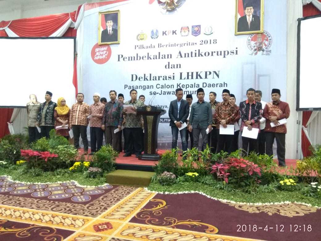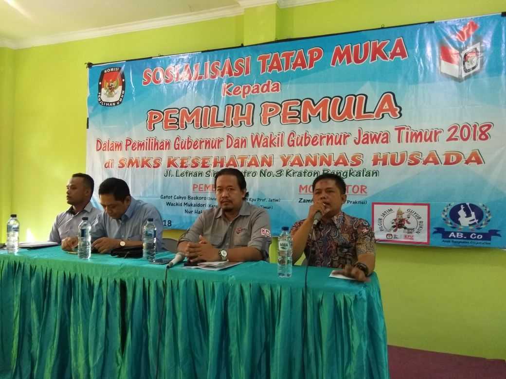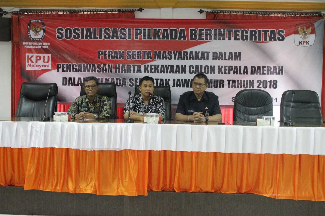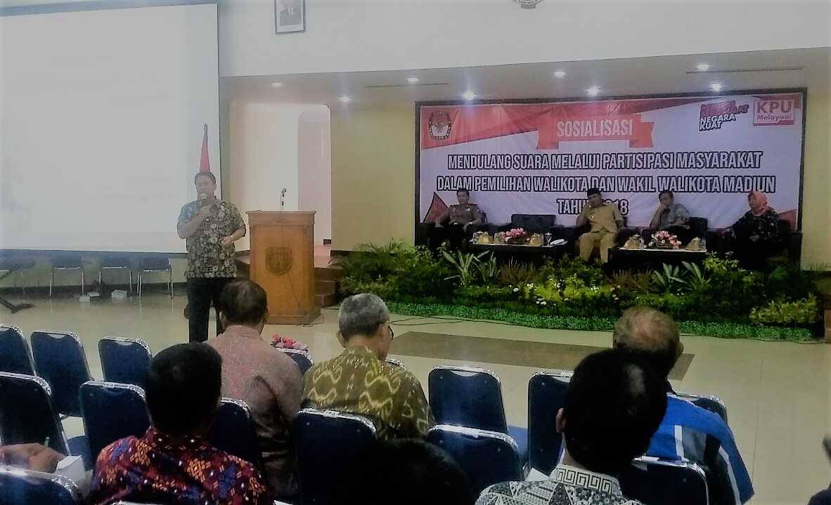 Madiun, jatim.kpu.go.id– Ketua Komisi Pemilihan Umum Jawa Timur (KPU Jatim), Eko Sasmito memberikan sosialisasi Pemilihan Gubernur dan Wakil Gubernur Jawa Timur (Pilgub Jatim) di Gedung Asrama Haji, jalan Ring Road Barat Kota Madiun, hari ini, Senin (16/4). Acara yang diinisiasi KPU Kota Madiun ini mengangkat tema “Mendulang Suara Melalui Partisipasi Masyarakat”. Dalam acara sosialisasi yang diikuti oleh ratusan peserta yang berasal dari jajaran Pemerintah Kota (Pemkot), Camat, Lurah serta seluruh Ketua RT se-Kota Madiun tersebut. Juga dihadiri oleh dua narasumber lain yakni Walikota Madiun Sugeng Rismiyanto dan Wakapolres Kota Madiun Kompol Mujito. Ketua KPU Jatim, Eko Sasmito, dalam paparan materinya menyampaikan bahwa dalam Pilgub Jatim 2018 akan diikuti oleh dua pasangan calon (Paslon). Nantinya, dalam menggunakan hak suara masyarakat tidak perlu bingung karena akan dipermudah. “Mekanisme menggunakan hak suara dalam Pilgub Jatim 27 Juni nanti, meskipun tidak ada formulir C6 tetap bisa mencoblos yakni dengan menggunakan e-KTP,” ujarnya (16/4/2018). Pria yang juga pernah menjabat Ketua KPU Kota Surabaya ini, dihadapan peserta sosialisasi juga menambahkan selain mencoblos juga jangan sampai menggunakan hak pilih dengan diseratai iming-iming dan imbalan berupa duit. Sebab, itu masuk dalam kategori money politic yang nantinya akan berkonsekuensi terhadap hukum. Bagi para pelaku, pemberi dan penerima money politic tidak hanya dikenakan denda berupa uang senilai Rp 200 juta sampai dengan Rp 1 Miliar. Eko menyebutkan, dalam Undang-undang Nomor 10 Tahun 2018 pasal 187 secara tegas juga sudah dijelaskan terkain sangsi pidana yang akan dikenakan bagi pelaku dan penerima money politic. “Ancaman pidana penjara yang akan dikenakan bagi pelaku dan penerima money politik, paling singkat 36 bulan dan paling lama 72 bulan,” ucapnya. (MC – EKA/BAY)