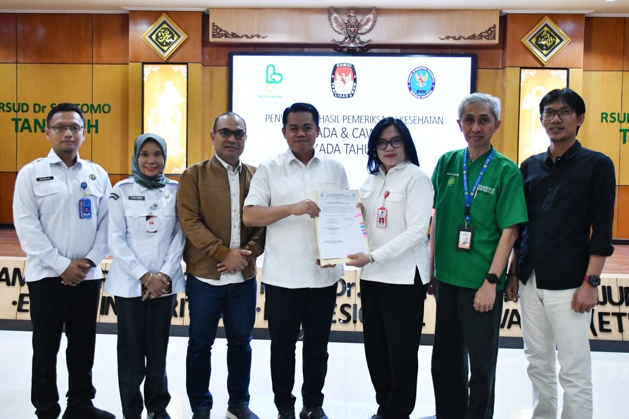 Surabaya, jatim.kpu.go.id - Komisi Pemilihan Umum Provinsi Jawa Timur (KPU Jatim) merima hasil tes kesehatan tiga pasangan calon Gubernur dan Wakil Gubernur Jatim 2024 dari RSUD dr. Soetomo Surabaya. Serah terima dilaksanakan di Ruang Loka Widya RSUD dr. Soetomo, Jalan Prof. Dr. Moestopo nomor 6-8, Gubeng, Surabaya, Senin, 2 September 2024. Ketua KPU Jatim Aang Kunaifi menjelaskan, berdasarkan hasil pemeriksaan dari tim kesehatan yang dibentuk RSUD dr. Soetomo, ketiga pasangan calon yang mendaftar dinyatakan mampu secara jasmani maupun rohani. Ketiga pasangan calon juga dinyatakan terbebas dari penyalahgunaan narkotika. "Berdasarkan kesimpulan dari majelis pemeriksa tim kesehatan yang ditunjuk RSUD dr. Soetomo, ketiga pasangan calon yang dilakukan pemeriksaan kesehatan dianggap mampu secara jasmani maupun rohani. Ketiga pasangan calon juga dipastikan tidak terindikasi pernah melakukan penyalahgunaan narkotika," kata Aang. Aang mengatakan, secara umum, seluruh proses pemeriksaan kesehatan bagi pasangan calon Gubernur dan Wakil Gubernur Jatim 2024 berjalan lancar. Hasil pemeriksaan kesehatan ketiganya juga diserahkan sesuai waktu yang telah ditetapkan. Aang pun mengucapkan terimakasih kepada tim kesehatan RSUD dr. Soetomo yang telah memfasilitasi dan mendukung kelancaran selama proses pemeriksaan kesehatan ketiga pasangan calon. Ia berharap, hasil pemeriksaan kesehatan yang keluar dapat diterima semua pihak. Direktur RSUD dr. Soetomo, Cita Rosita Sigit Prakoeswa menambahkan, proses pemeriksaan kesehatan pasangan calon Gubernur dan Wakil Gubernur Jatim 2024 tidaklah mudah. Namun, kata dia, berkat kerja sama dan dukungan dari seluruh stakeholder, penyelenggaraan rangkaian kegiatan pemeriksaan kesehatan pasangan calon Gubernur dan Wakil Gubernur Jatim 2024 dapat berjalan dengan lancar. "Ini merupakan tanggung jawab besar sekaligus kehormatan bagi kami," ujarnya. Ia pun memastikan, seluruh proses pemeriksaan kesehatan dilakukan dengan integritas tinggi tanpa adanya konflik kepentingan. “Semoga hasil pemeriksaan yang sudah dilakukan dapat bermanfaat bagi kita semua," ucapnya. (FIT)
