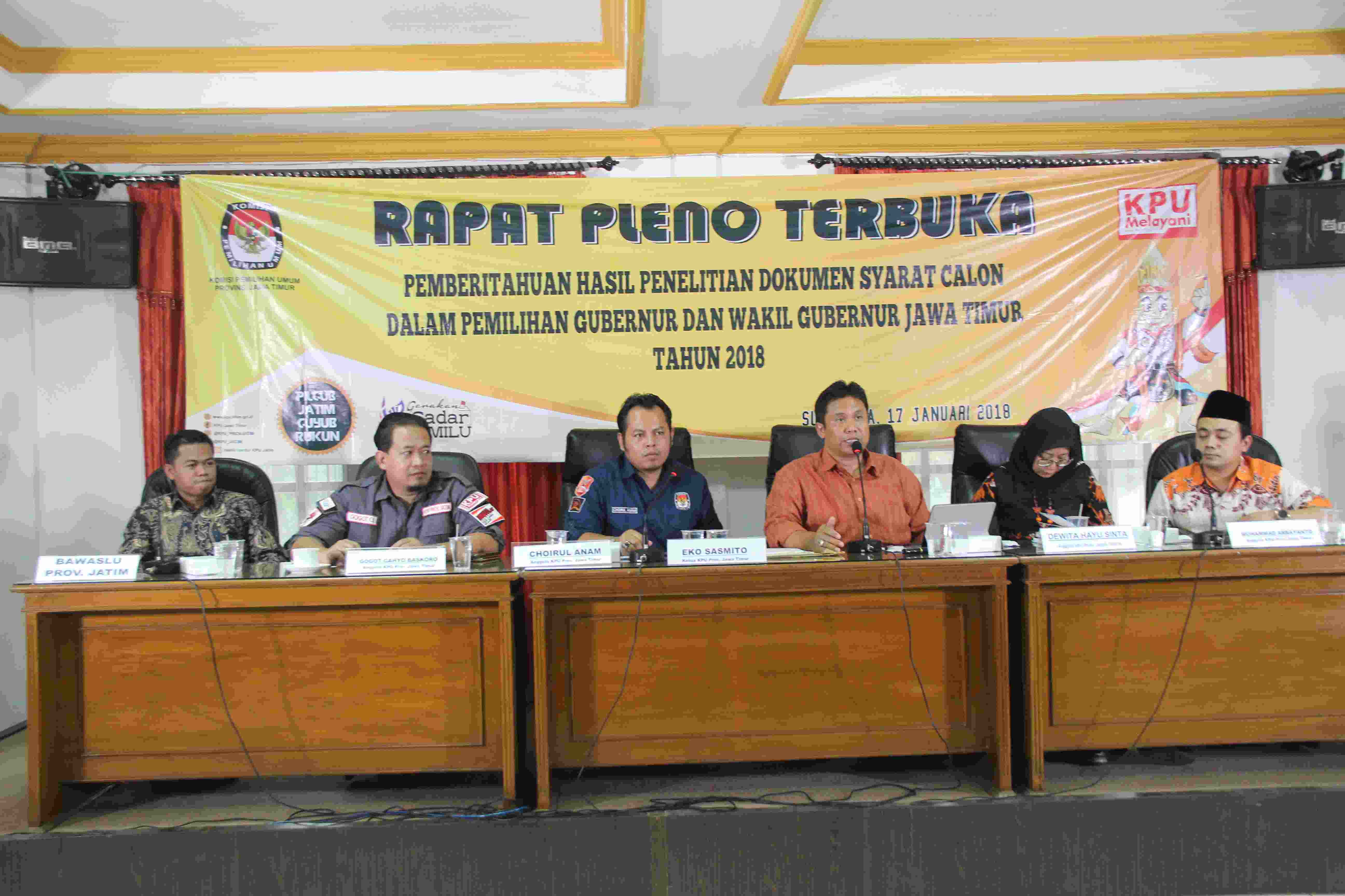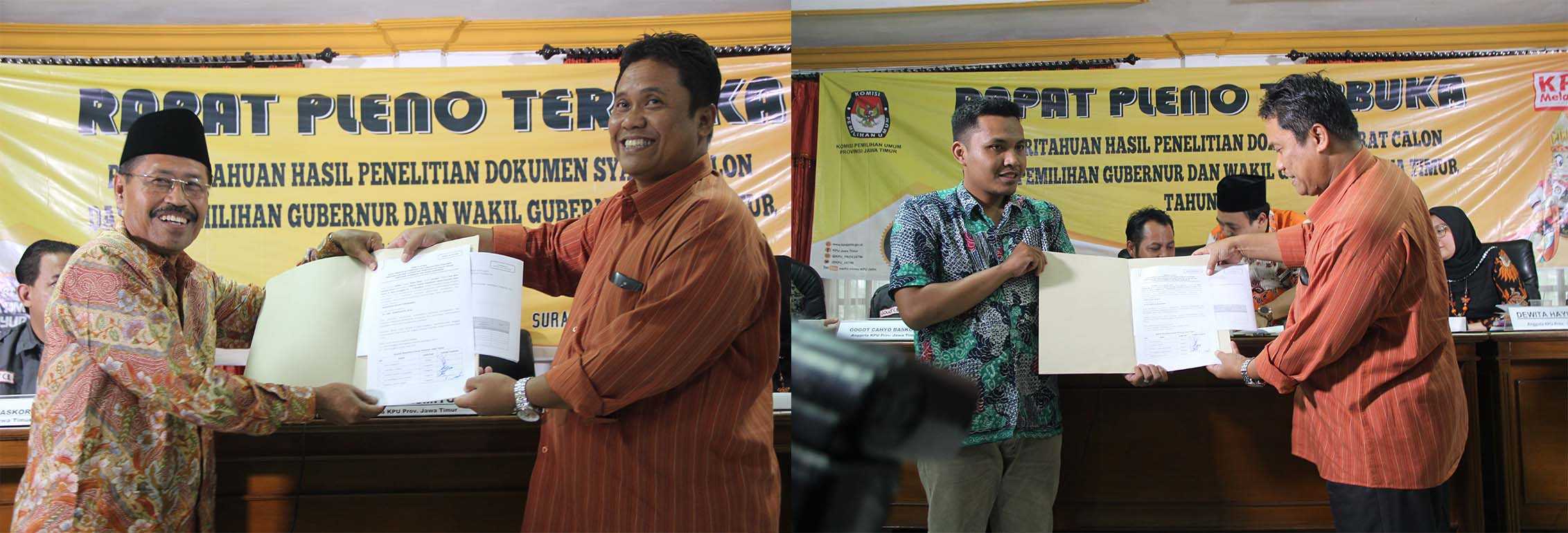 Surabaya, jatim.kpu.go.id- Selama tiga hari ke depan, tanggal 18 - 20 Januari 2018 memasuki tahapan perbaikan syarat calon bagi Bakal Pasangan Calon (Bacalon) Gubernur dan Wakil Gubernur Jawa Timur (Jatim). Dalam kurun waktu itu pula, kedua Bacalon yang sudah mendaftar diberi kesempatan untuk memperbaiki dan menyerahkan syarat calon. Kedua Bacalon Gubernur dan Wakil Gubernur Jatim, Khofifah Indar Parawansa - Emil Elestianto dan Saifullah Yusuf - Puti Soekarno Putri, selama tiga hari juga diberi kesempatan untuk memperbaiki dan menyerahkan syarat calon yang belum lengkap. Sebab, dari hasil penelitian yang sudah dilakukan, persyaratan calon dari kedua Bacalon masih menjalani tahap perbaikan. Divisi Teknis Komisi Pemilihan Umum Jatim, Muhammad Arbayanto, menyatakan sesuai dengan tahapan yang diatur dalam Peraturan KPU RI Nomor 1 tahun 2107, untuk jadwal perbaikan dan penyerahan syarat calon selama tiga hari. Mulai tanggal 18 - 20 Januari 2018 mendatang. “Jadi masih ada kesempatan selama tiga hari ke depan untuk melakukan perbaikan, kemudian bisa diserahkan kepada Kami untuk diproses lebih lanjut,” ujarnya. Pria yang akrab dipanggil Arba ini menjelaskan, untuk proses lebih lanjut setelah perbaikan dan penyerahan syarat calon, pihaknya akan melakukan tahapan pengumuman. Adapun pengumuman perbaikan dokumen syarat pasangan calon, akan diunggah melalui laman KPU Jatim di www.jatim.kpu.go.id. Jadwal untuk pengumuman di laman KPU Jatim, mulai tanggal 20 - 26 Januari 2018. Dalam waktu yang cukup lama tersebut, minimal seluruh publik bisa tahu secara langsung hasil dari perbaikan dokumen syarat calon Gubernur dan Wakil Gubernur Jatim. Baru setelah itu dilanjut dengan tahapan penetapan dan pengundian nomor urut pasangan calon. “Harapan Kami agar seluruh Bacalon memaksimalkan waktu yang untuk melakukan perbaikan, karena setelah itu sudah final dan tidak ada lagi perbaikan untuk syarat calon,” tegasnya. Sementara itu, dari hasil pantauan hari pertama masa perbaikan syarat calon Bacalon Gubernur dan Wakil Gubenur Jatim. Kedua Bacalon melalui tim penghubungnya mendatangi kantor KPU Jatim, untuk melakukan konsultasi terkait tahapan perbaikan tersebut. Saat konsultasi, kedua Bacalon diperlakukan yang sama. (MC – LNC/BAY)