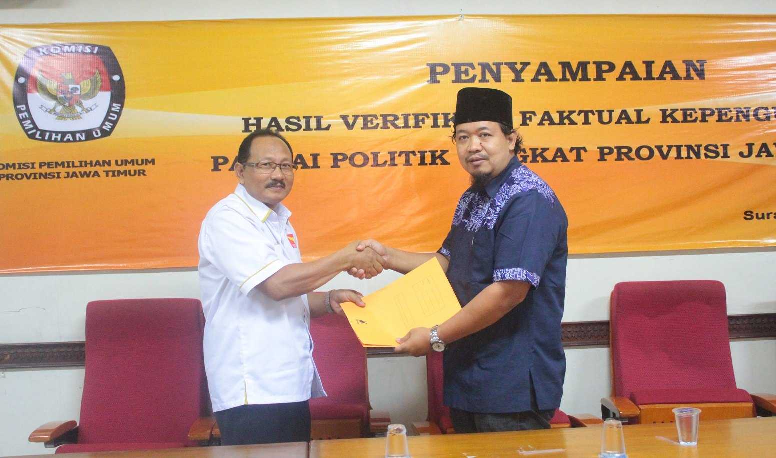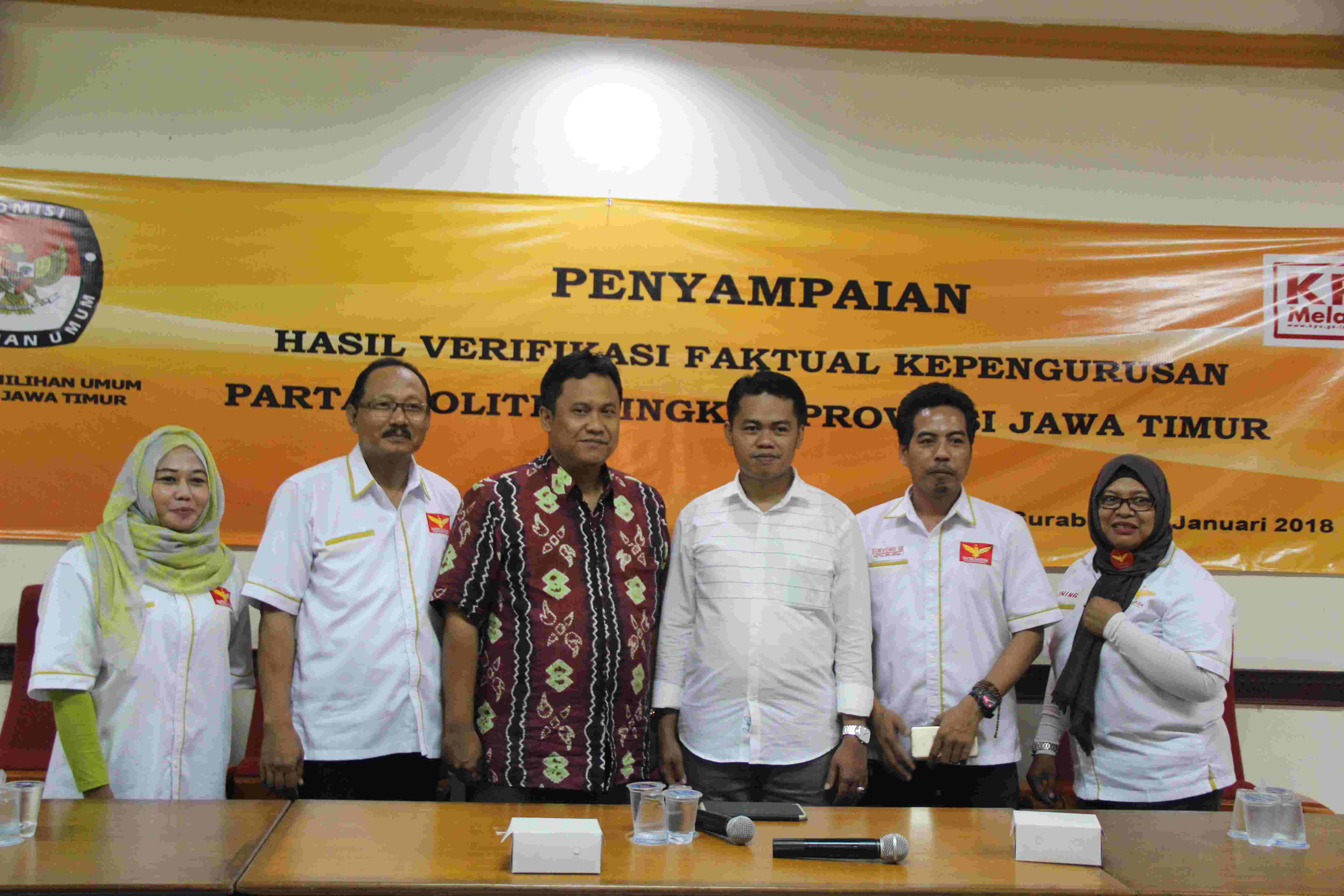 Surabaya, jatim.kpu.go.id- Perwakilan DPD Partai Garuda Provinsi Jawa Timur sampaikan perbaikan verifikasi faktual kepengurusan ke Komisi Pemilihan Umum Jawa Timur (KPU Jatim), hari ini, Rabu tanggal 3 Januari 2018, jam 2 siang. Penyampaian perbaikan ini diterima langsung oleh Divisi SDM dan Parmas KPU Jatim, Gogot Cahyo Baskoro serta Kepala Subbagian (Kasubbag) Hukum, Wiratmoko Iman Santoso. Acara ini juga dihadiri oleh Tim Asistensi Badan Pengawas Pemilu (Bawaslu) Provinsi Jawa Timur, Maulana Hasan dan 2 orang stafnya. Sekretaris DPD Partai Garuda Provinsi Jawa Timur, Harijono menyampaikan bahwa Partai Garuda kemarin (Selasa, 02/01) dinyatakan Belum Memenuhi Syarat (BMS) oleh KPU Jatim. Hal ini karena saat verifikasi kepengurusan inti, dirinya (Harijono-red) belum bisa menunjukkan KTP elektronik. “Kemarin saat verifikasi faktual, Saya belum bisa menunjukkan e-KTP,” terang Harijono (03/01). Harijono mengimbuhkan, “Dan hari ini Saya melakukan perbaikan dengan menyerahkan salinan data kepengurusan berupa Surat Keterangan e-KTP sementara”. Berikutnya Divisi SDM dan Parmas KPU Jatim, Gogot Cahyo Baskoro dalam sambutannya menuturkan jika pada intinya proses verifikasi faktual kepengurusan ini tidak ada unsur kepentingan apa pun bagi KPU Jatim. “Kami bekerja dan melakukan verifikasi ini karena amanah dari tahapan pemilu,” ujar Gogot. Selain itu, menurut Gogot, banyak sedikitnya parpol yang ada di Jawa Timur tidak akan mempengaruhi satuan kerja (satker) KPU Jatim. “Untuk proses selanjutnya, KPU Jatim juga minta kerja sama dari semua parpol, termasuk Partai Garuda,” pungkas Komisioner KPU Jatim ini. (TUNG/AACS)