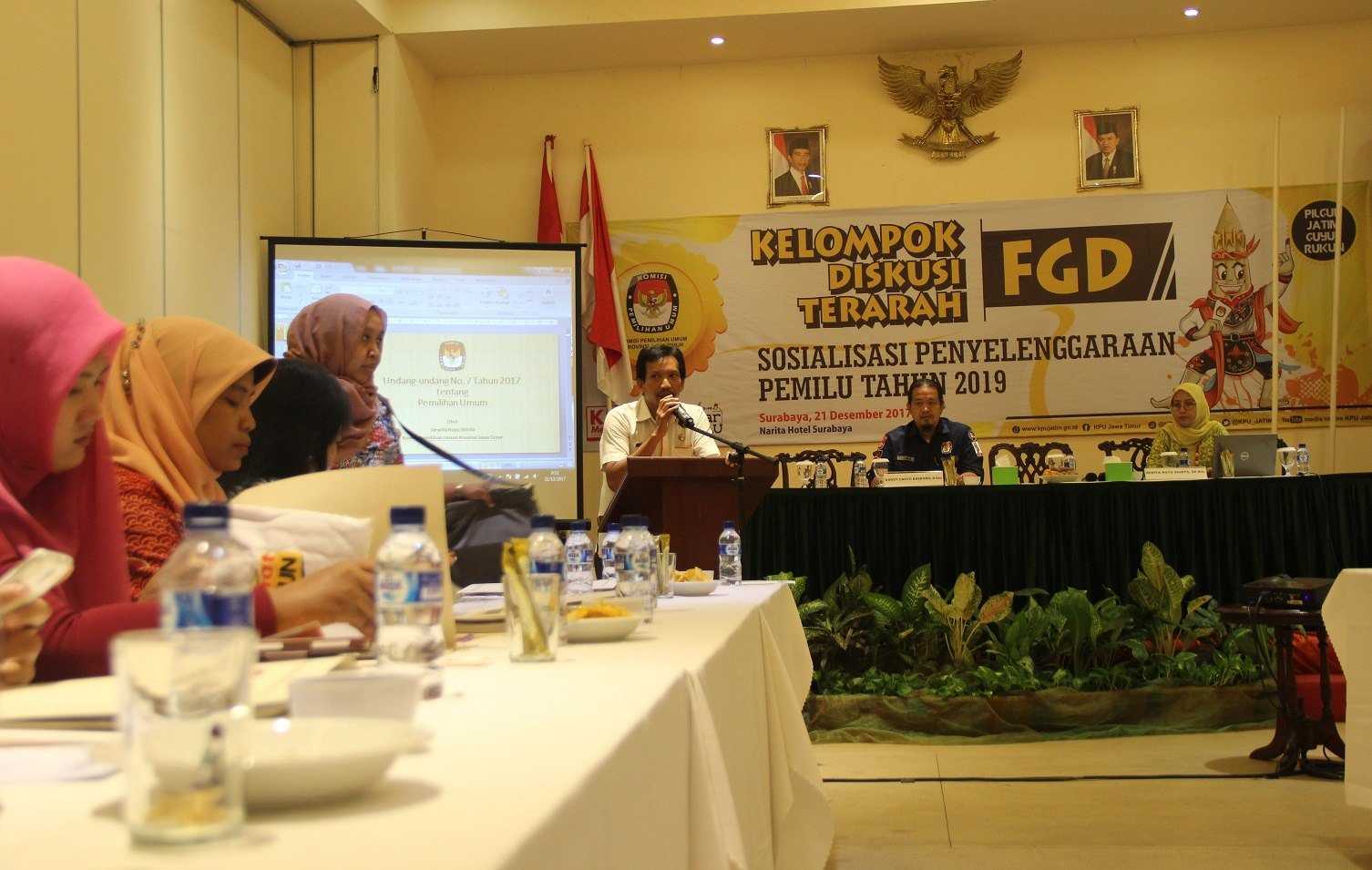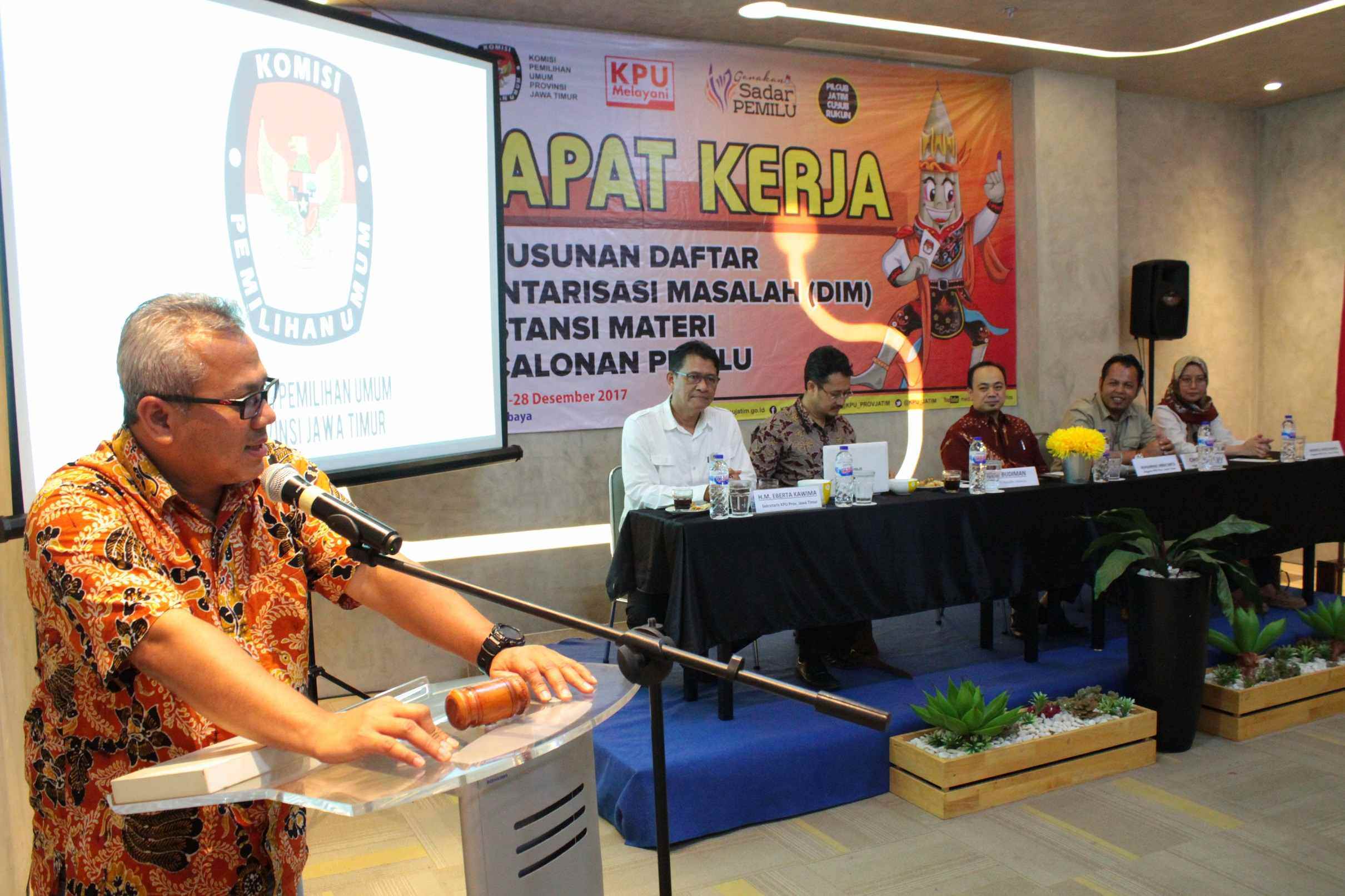 Surabaya, kpujatim.o.id- Komisi Pemilihan Umum Jawa Timur (KPU Jatim) melaksanakan Rapat Kerja (Raker) Penyusunan Daftar Inventarisasi Masalah (DIM), di Hotel Yello Surabaya, Rabu s.d Kamis (27- 28 Desember 2017). Adapun bahasan Raker penyusunan DIM, terkait substansi materi pencalonan Pemilu. Raker penyusunan DIM diikuti oleh Divisi Teknis KPU Kabupate/ Kota se-Jatim. Dengan beberapa paparan materi yang akan disampaikan. Materi pertama terkait penyusunan DIM akan disampaikan oleh Anggota KPU RI Periode 2012 – 2017, Ferry Kurnia Rizkiyansyah. Selanjutnya, pada sesi kedua akan masuk pada materi Rapat Kerja (Raker) DIM. Dalam Raker DIM tersebut, seluruh peserta dari KPU Kabupaten/Kota akan mengikuti sesi Focus Group Discussion (FGD). Selanjutnya, di hari kedua akan disambung dengan paripurna hasil rapat penyusunan DIM. Kabag Hukum, Teknis dan Hubungan Masyarakat (Hubmas) KPU Jatim, Slamet Setjoadji menyatakan raker penyusunan DIM penting untuk diikuti sampai tuntas oleh seluruh peserta dari KPU Kabupaten/ Kota. Terlebih, pemateri yang akan mengulas terkait DIM merupakan orang yang kompeten dan berpengalaman di bidangnya. “Harapan kami, agenda Raker Penyusunan DIM tersebut diikuti sampai selesai karena memang sangat penting,” ucapnya. (MC – BAY)