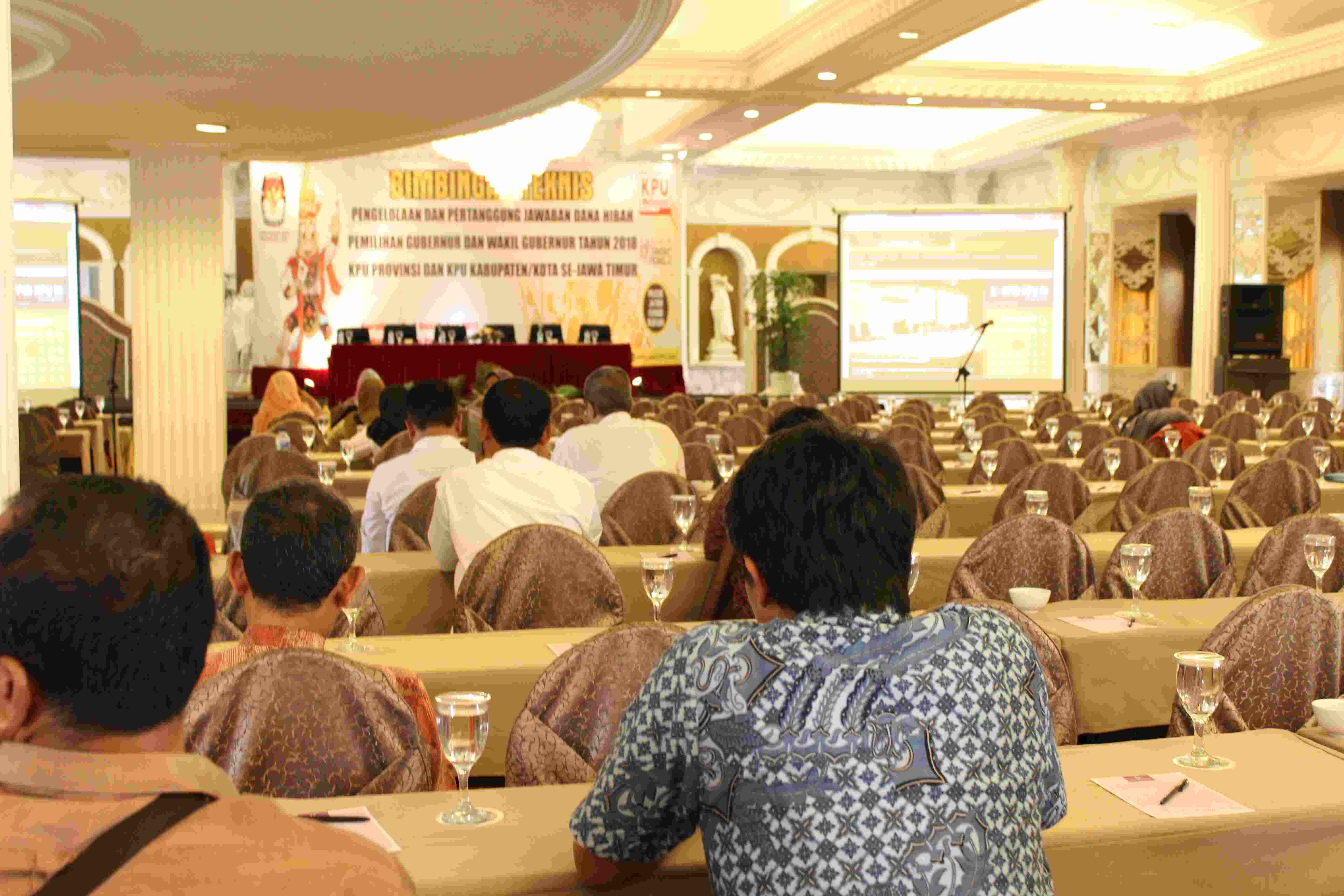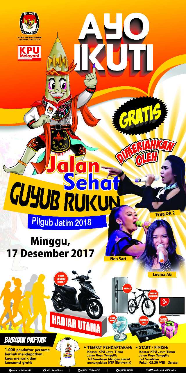 Surabaya, jatim.kpu.go.id- Sukses menyelenggarakan Gerak Jalan Sadar Pemilihan Serentak 2018, Oktober 2017 lalu. Kali ini Komisi Pemilihan Umum Jawa Timur (KPU Jatim) kembali melaksanan agenda yang sama dan lebih besar lagi, yakni Jalan Sehat “Guyub Rukun” Pemilihan Gubernur dan Wakil Gubernur Jawa Timur (Pilgub Jatim) 2018. Bedanya, jumlah peserta Jalan Sehat “Guyub Rukun” yang digelar Minggu 17 Desember 2017 mendatang bakal lebih meriah dan membludak pesertanya. KPU Jatim menargetkan sedikitnya 4 ribu orang peserta dalam kegiatan ini. Kupon undian bisa didapat di kantor KPU Jatim Jalan Raya Tenggilis 1 – 3 Surabaya. Tidak hanya target peserta yang bertambah. KPU Jatim juga menambah nilai dan bobot hadiah Jalan Sehat “Guyub Rukun” Pilgub Jatim 2018. Hadiah utama yang disiapkan yakni satu unit sepeda motor dan puluhan hadiah lainnya seperti kulkas, sepeda gunung, telivisi LED, kompor gas serta beberapa hadiah menarik lainnya. Jalan Sehat “Guyub Rukun” Pilgub Jatim 2018, juga dipastikan akan lebih heboh lagi karena akan dimeriahkan dengan sederet artis dangdut kenamaan asal Jawa Timur. Beberapa di antaranya ada Erna D’Academy 2, Neo Sari dan Lovina AG, yang semuanya akan totalitas dalam menghibur peserta jalan sehat. “Target kami pesertanya 4 ribu orang, yang nantinya juga akan seiring dengan hadiah yang cukup besar dibanding sebelumnya. Sederet artis kenamaan asal Jatim juga akan menghibur peserta jalan sehat, yang pasti bakal lebih meriah,” ujar Divisi Sumber Daya Manusia dan Partisipasi Masyarakat (SDM dan Parmas) KPU Jatim Gogot Cahyo Baskoro, Jum'at, 8 Desember 2017. Gogot mengajak seluruh masyarakat Jawa Timur, khususnya yang ada di Surabaya dan sekitarnya untuk hadir dalam acara Jalan Sehat “Guyub Rukun” Pilgub Jatim 2018. Dia menambahkan, untuk 1.000 orang pendaftar pertama berhak memperoleh kaos “Guyub Rukun” yang akan ditukar saat hari H pelaksanaan. “Sedangkan untuk pendaftar selanjutnya, meski tidak dapat kaos tetap berhak memperoleh kupon dengan hadiah utama satu unit sepeda motor,” terangnya. Perlu diketahui, semangat utama dari jalan sehat “Guyub Rukun” selain menjadi ajang sosialisasi Pilgub Jatim 2018, juga dalam rangka menyasar seluruh segmen pemilih di antaranya basis keluarga dan pemilih pemula. Targetnya, tentu juga guna meningkatkan partisipasi pemilih dalam Pilgub Jatim yang dilaksanakan Rabu 27 Juni 2018 nanti. (MC – BAY)
