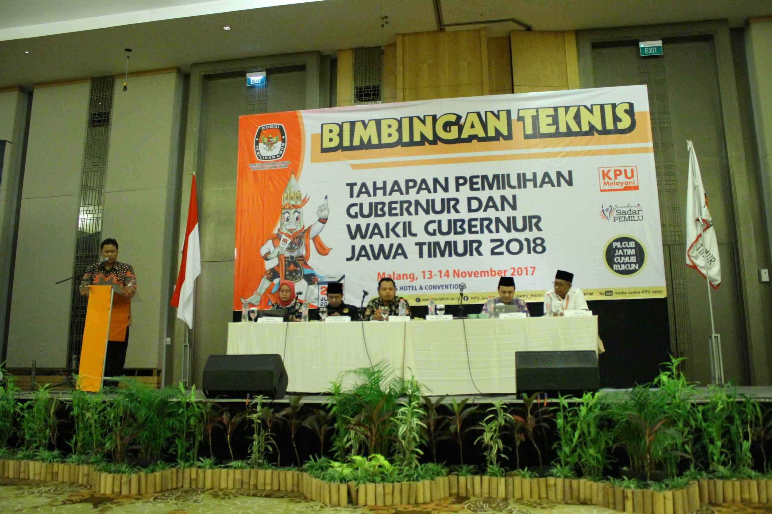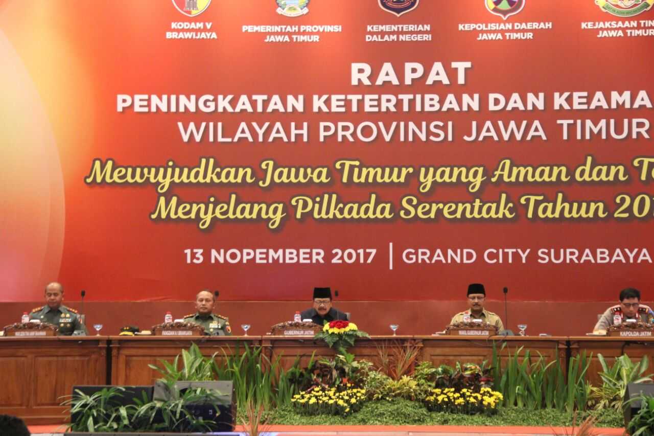 Surabaya, jatim.kpu.go.id- Forum Komunikasi Pimpinan Daerah (Forkopimda) Provinsi Jawa Timur (Jatim), mengadakan Rapat Peningkatan Ketertiban dan Keamanan Wilayah Provinsi Jawa Timur, di Convention Hall Grand City Surabaya, Senin 13 Nopember 2017. Rapat mengambil tema, mewujudkan Jawa Timur yang aman dan tentram menjelang Pilkada serentak Tahun 2018. Gubernur Jawa Timur Soekarwo dalam sambutannya menyatakan, ada 18 kabupaten/kota yang akan mengadakan Pilkada serentak 2018 di Jawa Timur. Dengan banyaknya jumlah kabupaten/kota yang akan menggelar Pilkada, dia berharap pesta demokrasi berjalan lancar dan tidak ada permasalahan atau konflik yang terjadi dalam prosesnya. “Dengan adanya Rapat Forkopimda Pilkada Jatim serentak 2018 bisa berjalan dengan aman, lancar dan tertib,” ujarnya. Pria yang akrab dipanggil Pakde Karwo menerangkan, setidaknya ada beberapa faktor pemicu konflik dalam penyelenggaraan Pemilu/Pilkada. Salah satunya, penyelenggara Pilkada tidak netral, Sumber Daya Manusia (SDM) kurang profesional, Daftar Pemilih Tetap (DPT) tidak akurat dan peserta atau pasangan calon (Paslon) tidak legowo. Pakde Karwo menambahkan, penyelenggara Pemilu masuk dalam salah satu pemicu konflik yang kadang bisa menyebabkan kerusuhan, karena kaitannya dengan netralitas penyelenggara. Ke depan, harapannya perlu adanya pengawasan yang lebih kuat dan ketat oleh masyarakat maupun Bawaslu sehingga tidak muncul penyelenggara yang kurang netral. "Sebagai pelaksana lapangan ada pada Kades (Kepala Desa) dan aparatnya, sedang kordinator dari pelaksana adalah pimpinan kecamatan seperti Camat, Koramil dan Kapolsek. Harapannya mereka minimal menjadi bagian untuk menjaga ketertiban dan keamanan,” ucapnya. (MC – TUNG/BAY)