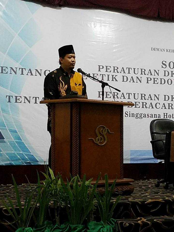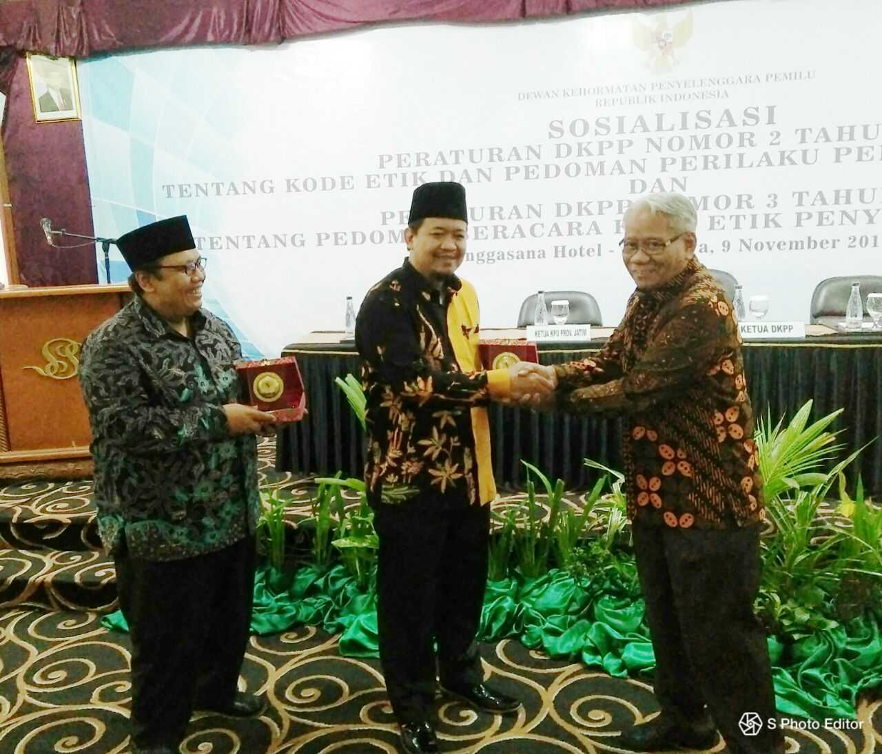 Surabaya, jatim.kpu.go.id- KPU dan Bawaslu Jatim memberikan apresiasi atas digelarnya sosialisasi peraturan DKPP, yang digelar di Hotel Singgasana, Kamis 9 Nopember 2017. Sosialisasi sangat penting untuk menjadi pedoman ke depan, dalam mengahadapi Pilkada Serentak 2018 dan Pemilu 2019. Divisi Sumber Daya Manusia dan Partisipasi Masyarakat (SDM dan Parmas) KPU Jatim, Gogot Cahyo Baskoro dalam sambutannya yang mewakili Ketua KPU Jatim Eko Sasmito menyatakan, sebuah kehormatan menjadi tuan rumah dalam acara sosialisasi peraturan DKPP. Sekaligus terima kasih karena telah memilih Jatim, sebagai tempat pertama dilakukan sosialisasi. "Mudah-mudahan acara lancar dan berjalan maksimal. Peserta bisa memperoleh hasil dari sosialisasi tersebut," ujar Gogot. Mantan Komisioner KPU Jember ini menerangkan bahwa keberadaan DKPP sangat penting di dalam penyelenggaraan Pilkada Serentak dan Pemilu. Menurutnya, DKPP tidak hanya warning, sekaligus juga merupakan pengayom dan pembersih nama baik penyelenggara Pilkada dan Pemilu dari sahwa sangka yang dituduhkan. "Termasuk dengan adanya rehabilitasi nama baik. Itu sangat membantu kami bebas dari tuduhan yang miring, terkait persoalan yang dilaporkan selama Pilkada dan Pemilu," ungkapnya. Hal yang sama dikatakan oleh Ketua Bawaslu Jatim, Moh Amin, yang juga menyampaikan terima kasih dan mengapresiasi kegiatan sosialisasi peraturan DKPP. Dia menyebut, kegiatan yang dilakukan oleh DKPP tentu mempunyai daya tarik, yang sekaligus menjadi semangat menjelang hari pahlawan. Selain menjadi bahan belajar, kegiatan sosialisasi sekaligus akan menjadi modal untuk menambah semangat agar lebih berintegritas. "Semangat kami siap menjaga integritas untuk Pemilu yang lebih baik. Harapannya, kegiatan sosialisasi ini bisa bermanfaat bagi seluruh jajaran Bawaslu," ungkapnya. Perlu diketahui, DKPP RI menggelar sosialisasi dua peraturan sekaligus yakni Peraturan DKPP Nomor 2 Tahun 2017 tentang kode etik dan pedoman perilaku penyelenggara Pemilu, serta Peraturan DKPP Nomor 3 Tahun 2017 tentang pedoman beracara kode etik penyelenggara Pemilu. (MC - BAY)