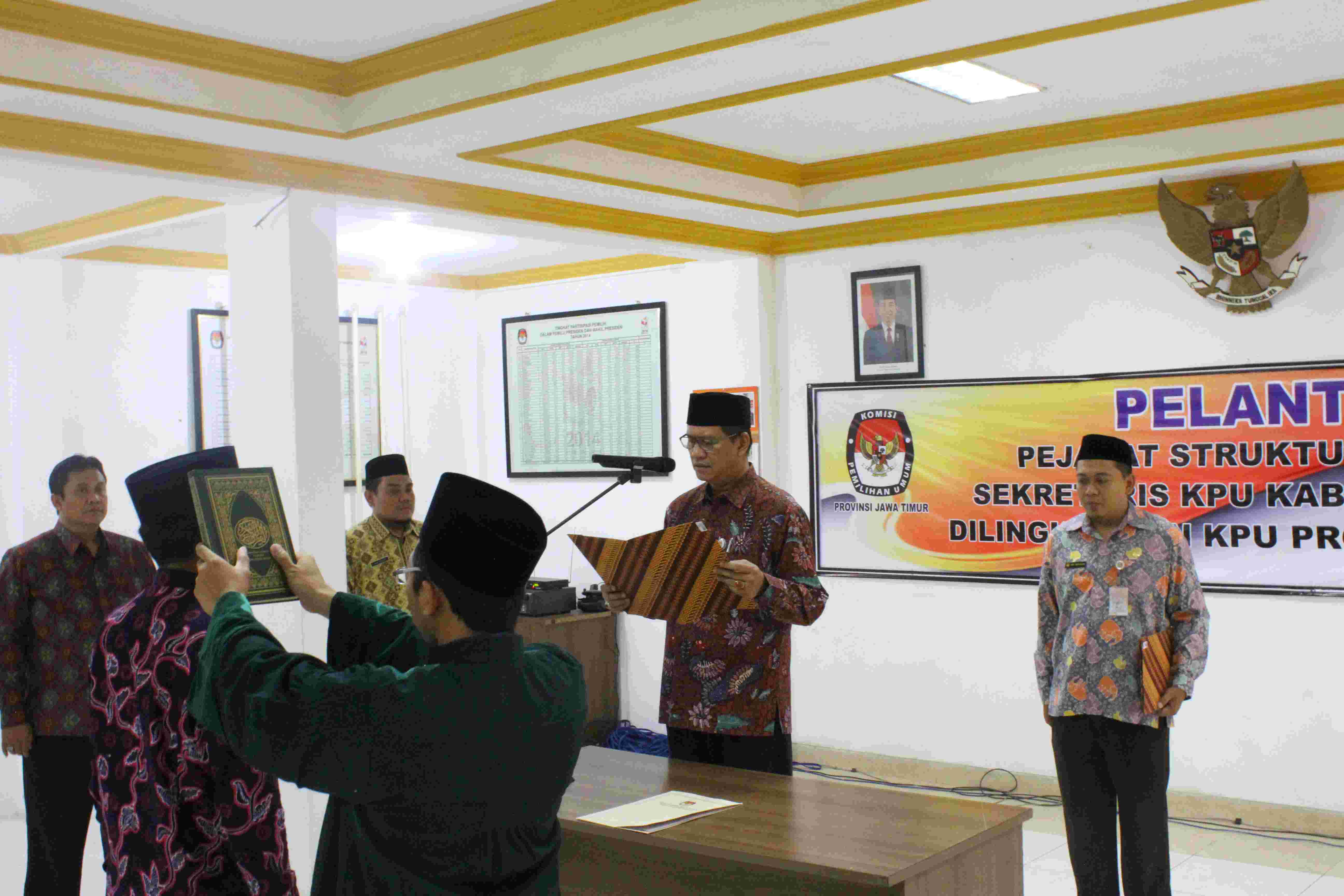 Surabaya, jatim.kpu.go.id- Anwar Sayuri Yusuf resmi menjabat Sekretaris KPU Kabupaten Sumenep secara definitif, setelah dilantik di kantor Komisi Pemilihan Umum Jawa Timur (KPU Jatim), Selasa 24 Oktober 2017. Usai dilantik, pejabat baru itu diminta untuk tancap gas dan menyesuaikan diri dengan lingkungan dan ritme kerja di KPU setempat. “Dengan dilantiknya secara definitif Saudara Anwar sebagai Sekretaris KPU Kabupaten Sumenep, harus segera tancap gas,” pesan Sekretaris KPU Jatim, HM. Eberta Kawima, dalam sambutannya di acara pelantikan (24/10/2017). Pria yang akrab dipanggil Wima ini menambahkan, selain harus segera tancap gas menyusuaikan dengan iklim kerja KPU. Pihaknya juga berpesan agar Sekretaris KPU Kabupaten Sumenep yang baru, untuk lebih mengembang tanggungjawab yang diberikan dan bisa dijalankan dengan amanah dengan baik. “Tentunya bisa bekerjasama baik dengan Anggota KPU Kabupaten Sumenep, maupun dengan KPU Provinsi Jawa Timur,” pintanya. Dalam pelantikan tersebut, juga dihadiri oleh beberapa jajaran komisioner dan staf KPU Jatim. Terlihat hadir menyaksikan proses pelantikan Ketua KPU Jatim, Eko Sasmito, Divisi SDM dan Parmas KPU Jatim, Gogot Cahyo Baskoro. Sementara itu, Sekretaris KPU Kabupaten Sumenep, Anwar Sayuri Yusuf menyatakan siap untuk menjalankan amanah yang disampaikan dalam pelantikan. Mantan Camat Batang-Batang Kabupaten Sumenep ini, akan segara melakukan koordinasi dan konsolidasi internal. “Saya juga siap koordinasi aktif dengan KPU Jatim, terlebih saat ini tahapan Pilgub yang sudah berjalan,” tegasnya. (MC – TUNG/BAY)