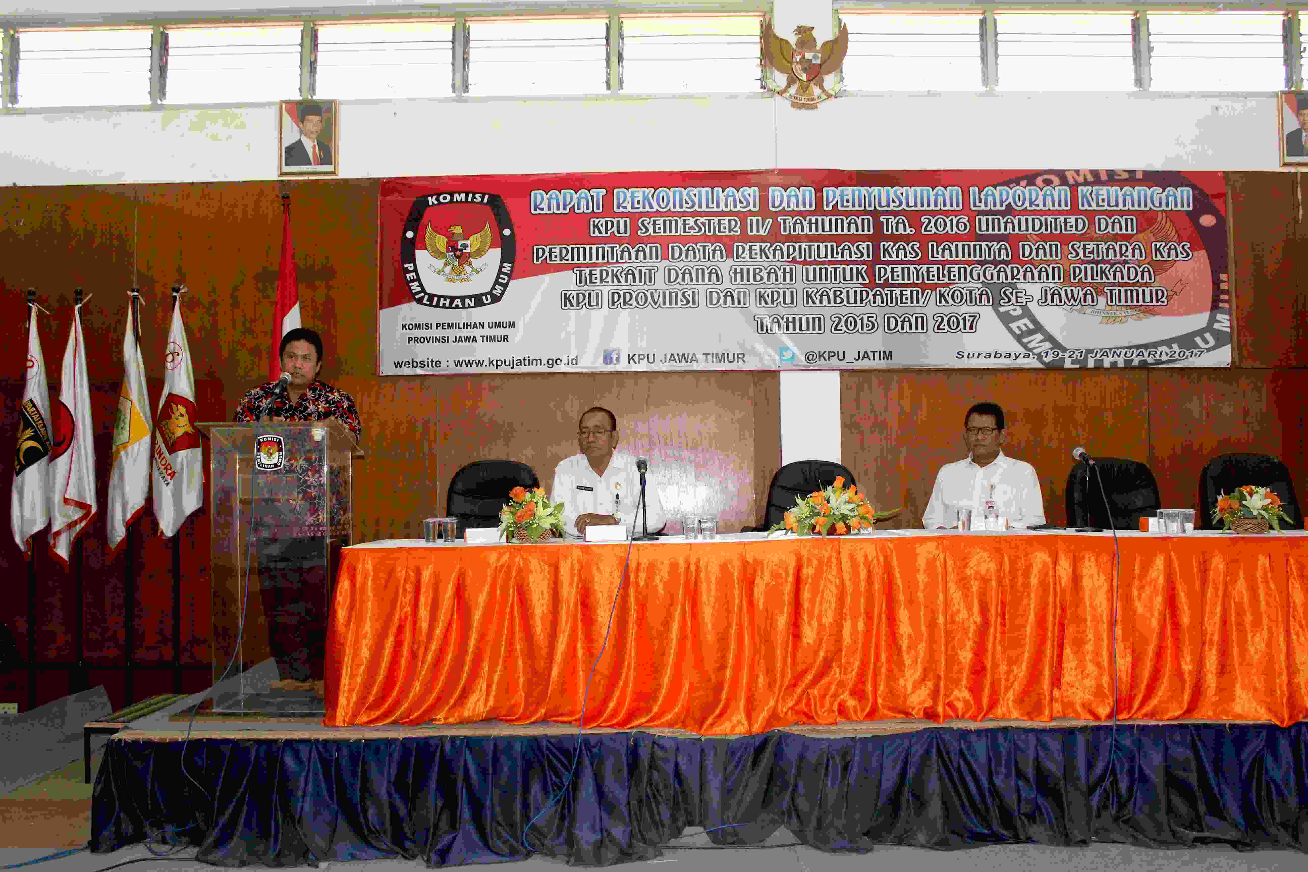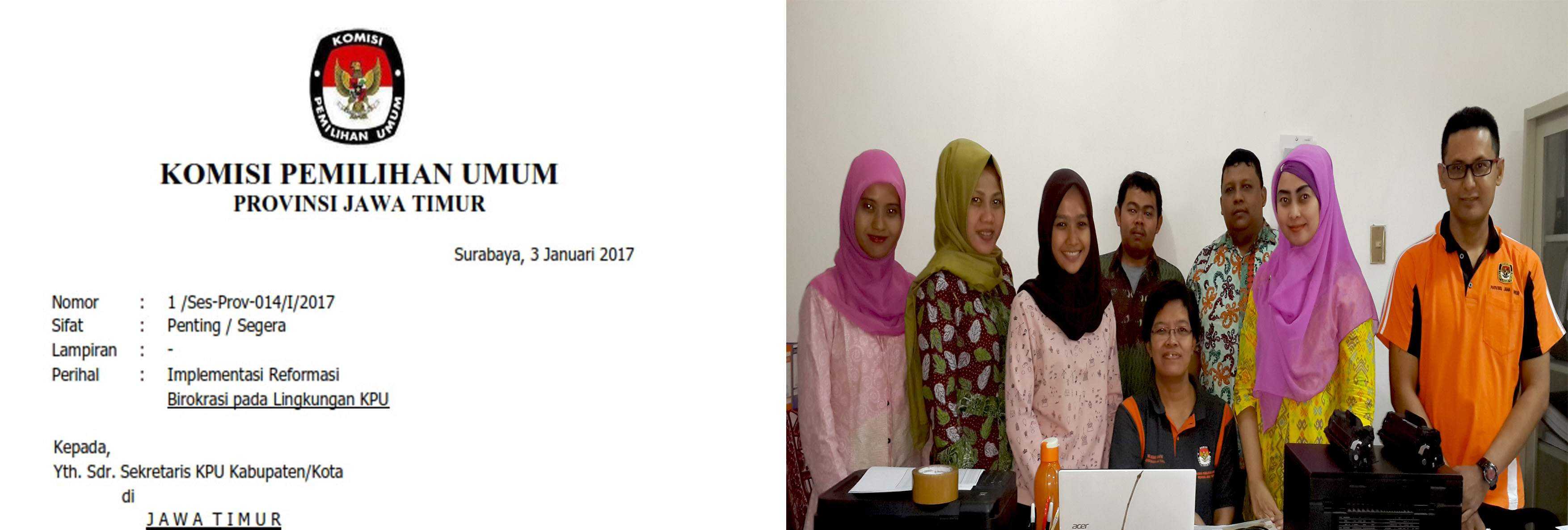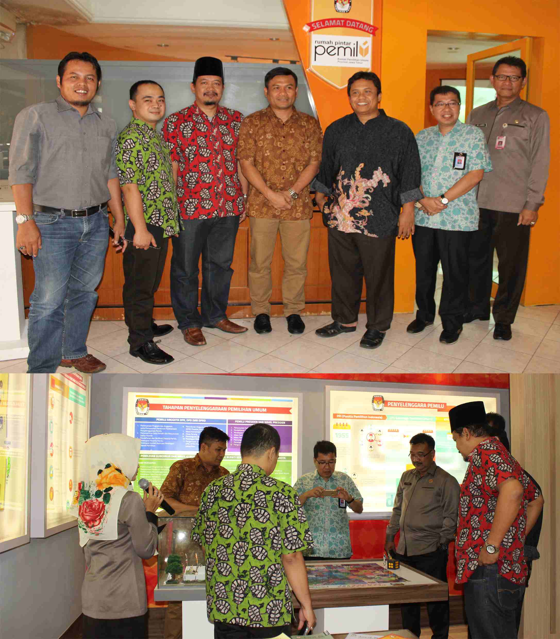 Surabaya, jatim.kpu.go.id- Komisi Pemilihan Umum Jawa Timur (KPU Jatim) usai melakukan Bimbingan Teknis Tim Pemandu Rumah Pintar Pemilu (RPP) Punakawan, hari ini (Rabu, 18/01) jam satu siang menerima kunjungan dari KPU Riau mengenai pembangunan RPP. Kunjungan dilakukan dalam rangka study banding/ koordinasi/ evaluasi pilot project pembangunan RPP. Datang dari KPU Riau, Ketua KPU Riau, Nurhamin, Sekretaris, Rudinal, dan Kepala Subbagian (Kasubbag) Teknis dan Hupmas, Nirson. Kunjungan mendapatkan sambutan dari Ketua KPU Jatim, Eko Sasmito, Divisi SDM dan Parmas, Gogot Cahyo Baskoro, Divisi Perencanaan dan Data, Choirul Anam, Divisi Teknis, Muhammad Arbayanto, dan Sekretaris, HM. Eberta Kawima. Pada kesempatan ini sekaligus menjadi moment pertama bagi Tim Pemandu RPP KPU Jatim untuk memulai tugasnya, setelah mendapatkan Bimtek. Tim Pemandu memberikan sambutan atas kedatangan KPU Riau di RPP Punakawan KPU Jatim. Selanjutnya, Tim Pemandu membantu mengarahkan dan memberikan panduan kepada para tamu menuju satu tempat ke tempat lain yang ada di dalam RPP Punakawan KPU Jatim. Ditemui usai melakukan kunjungan/ visitasi RPP Punakawan, Sekretaris KPU Riau, Rudinal memberikan apresiasi kepada RPP Punakawan KPU Jatim. “Banyak inovasi yang dilakukan KPU Jatim untuk mengisi RPP-nya. Tentu ini menjadi bahan masukan bagi pembangunan RPP di KPU Riau, yang akan dibangun di Tahun 2017 ini. Selain itu, bangunan KPU Jatim yang merupakan bekas mess DPRD Provinsi Jatim ini, justru juga menambah keunikan tersendiri bagi bangunan RPP,” ujar Rudinal (18/01/2017). Sekretaris KPU Riau saat diwawancarai mengungkapkan pula bahwa selain ke KPU Jatim, juga akan melakukan kunjungan ke KPU Jawa Tengah, KPU Daerah Istimewa Yogyakarta, dan KPU Jawa Barat. (AACS)