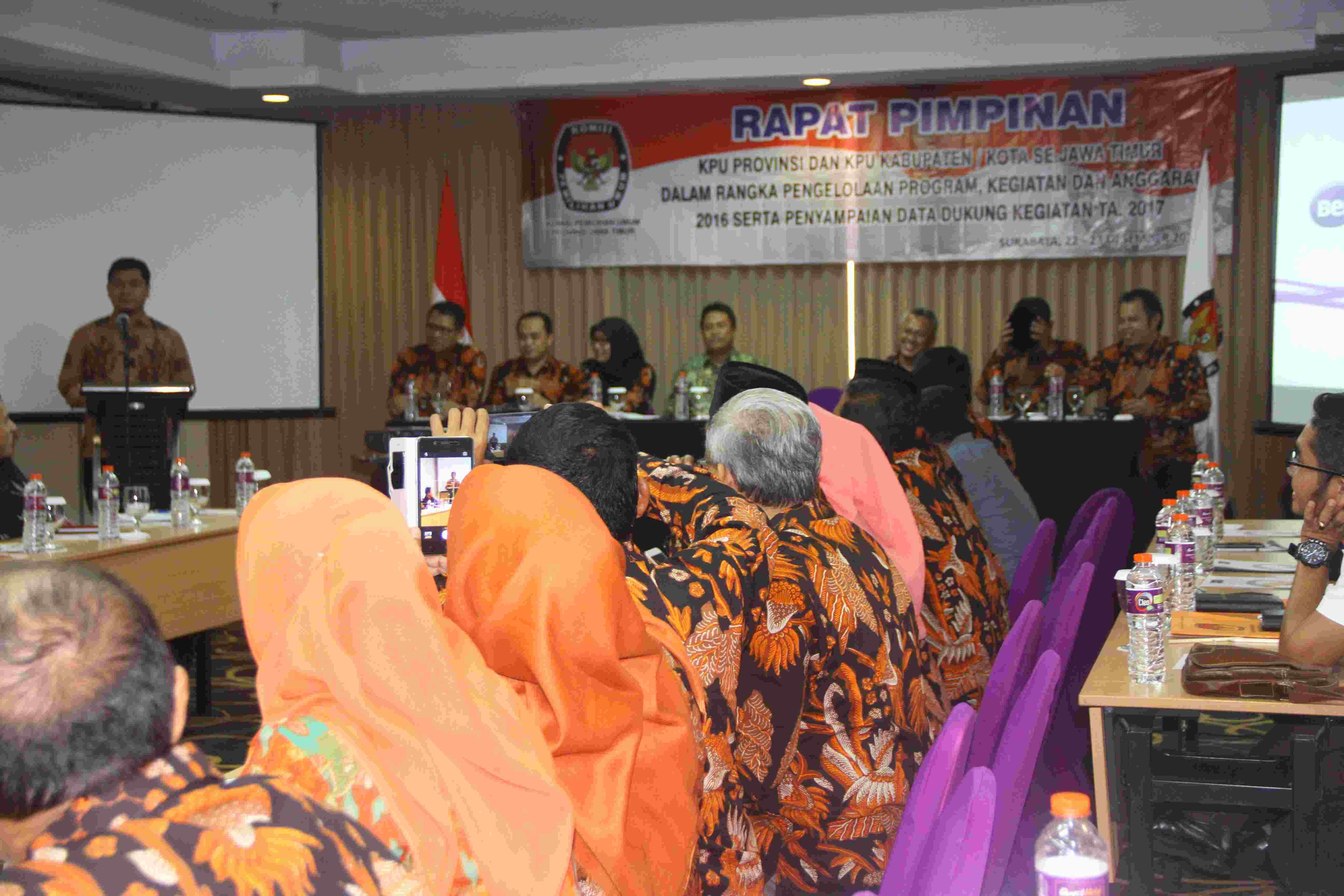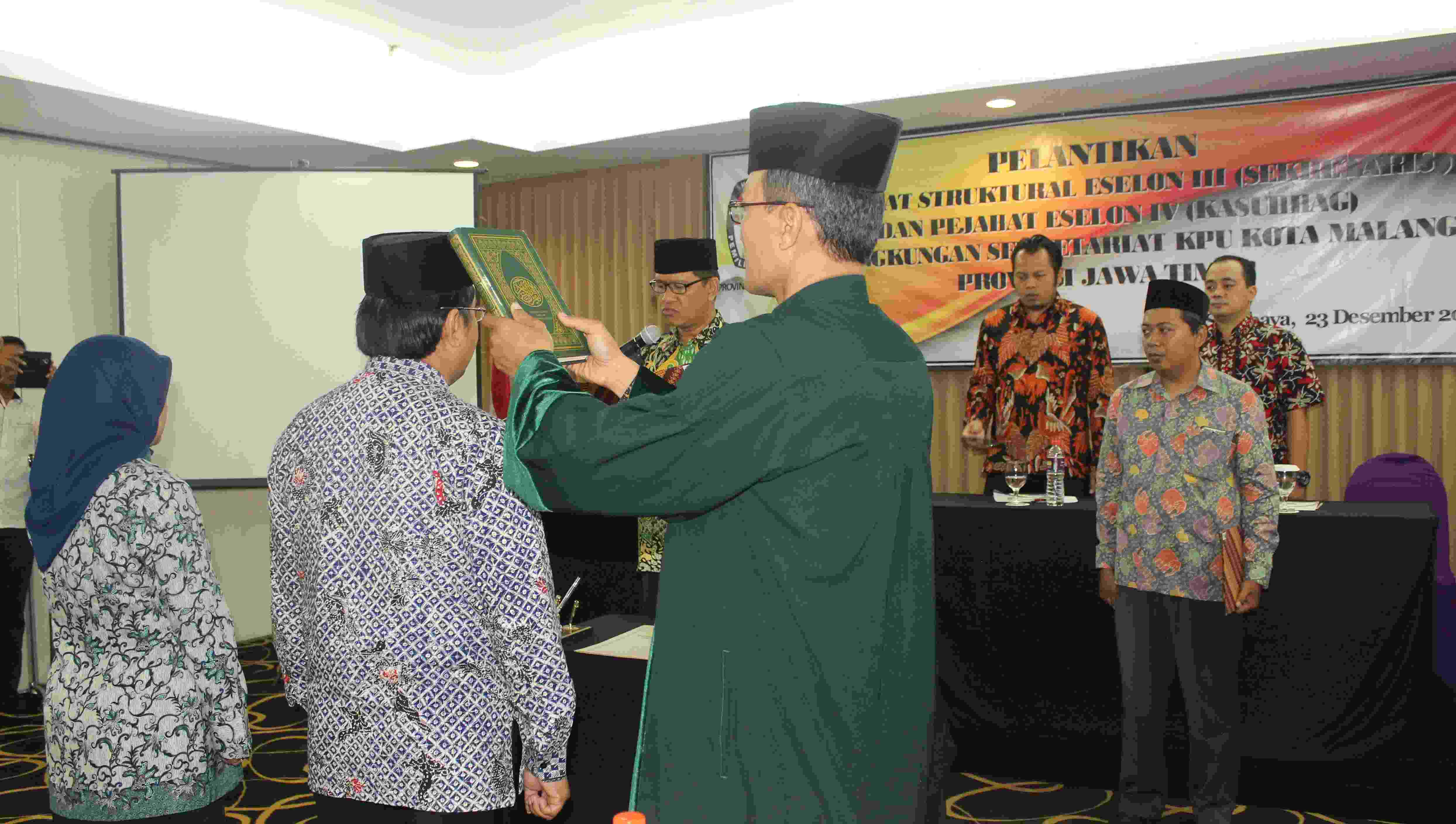 Surabaya, jatim.kpu.go.id- Sekretaris Komisi Pemilihan Umum Jawa Timur (KPU Jatim), HM. Eberta Kawima lantik Sekretaris dan Pj. Kepala Subbagian (Kasubbag) Umum KPU Kota Malang hari ini, Jum’at, tanggal 23 Desember 2016. Bertempat di Hotel Quest Surabaya kurang lebih pukul 08.30 WIB pelantikan ini dilaksanakan, dengan disaksikan Anggota KPU Jatim serta Ketua dan Sekretaris dari 38 KPU kabupaten/ kota yang juga mengikuti Rapat Pimpinan (Rapim) selama dua hari ini. Pada kesempatan ini, Sekretaris KPU Jatim mengucapkan selamat atas dilantiknya Sailendra sebagai Sekretaris KPU Kota Malang dan Kamilia Cahyani sebagai Pj, Kasubbag Umum KPU Kota Malang. Sebelum menjabat sebagai Sekretaris KPU Kota Malang, Sailendra menjabat sebagai Kepala Bidang Perindustrian Industri Logam, Masein, elektronika, Tekstil, dan Aneka, dan Industri Alat Transportasi dan Telematika Dinas Perindustrian dan Perdagangan Kota Malang. Wima dalam sambutannya, mengamanatkan bahwa setiap keputusan yang ada di KPU harus diputuskan secara bersama-sama, tidak dapat diputuskan sendiri-sendiri. “Hal ini harus digaris bawahi dan dipahami betul. Karena Kita adalah lembaga struktural yang memutuskan suatu hal secara bersama-sama enam orang yang menjadi pimpinan. Enam orang itu, ada 5 Anggota KPU dan 1 orang Sekretaris KPU. Harus bermusyawarah bersama untuk menghasilkan suatu keputusan,” jelas Sekretaris KPU Jatim (23/12/2016). Sekretaris KPU Jatim ini menuturkan pula, posisi yang sekarang diisi ini sudah lama kosong. Melihat saat ini sudah memasuki akhir tahun, pembukuan keuangan termasuk SPJ-SPJ yang masih tertunda harus segera diselesaikan. Usai pembacaan petikan Surat Keputusan Sekjen KPU RI dan Keputusan Sekretaris KPU Jatim, pengambilan sumpah, penandatanganan Berita Acara Sumpah, kata-kata pelantikan, sambutan, serta pembacaan do’a, kemudian dilanjutkan dengan pemberian ucapan selamat kepada terlantik. Dengan pemberian ucapan selamat ini maka menandakan acara pelantikan Sekretaris dan Pj, Kasubbag Umum KPU Kota Malang telah selesai. (AACS)