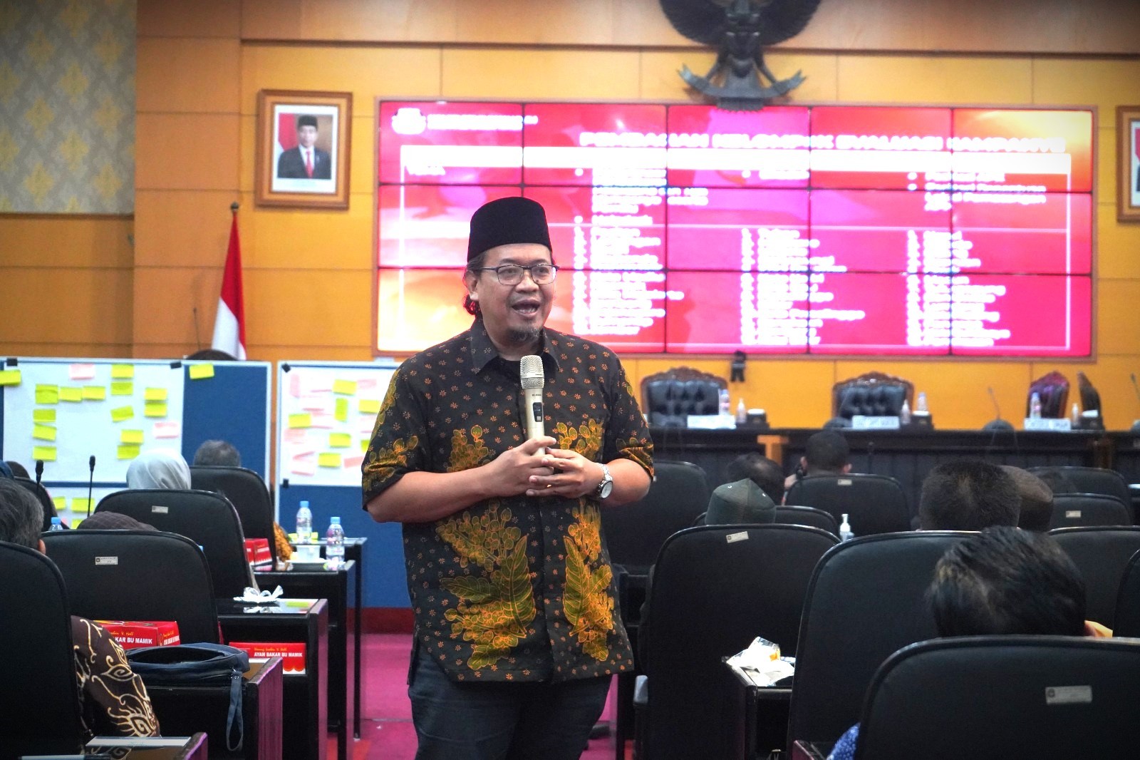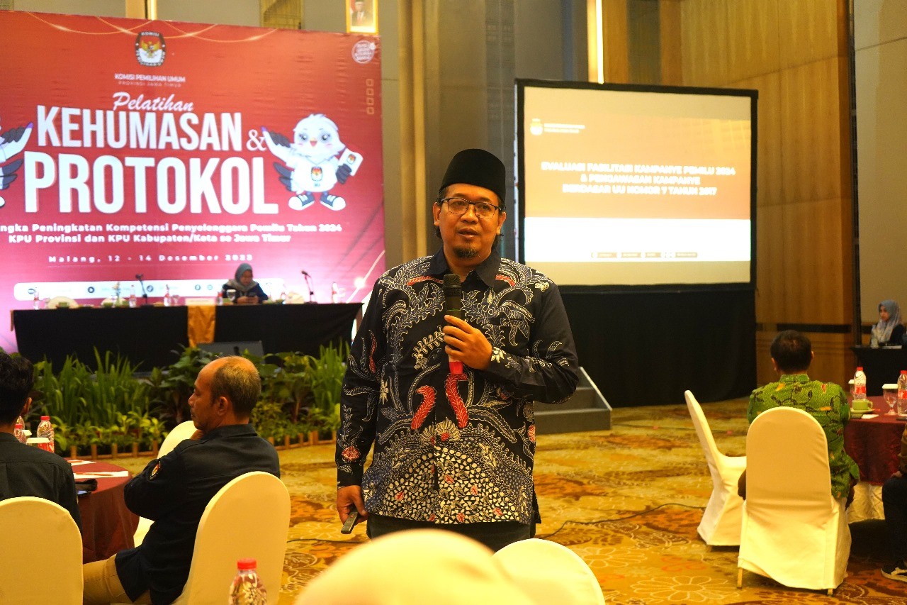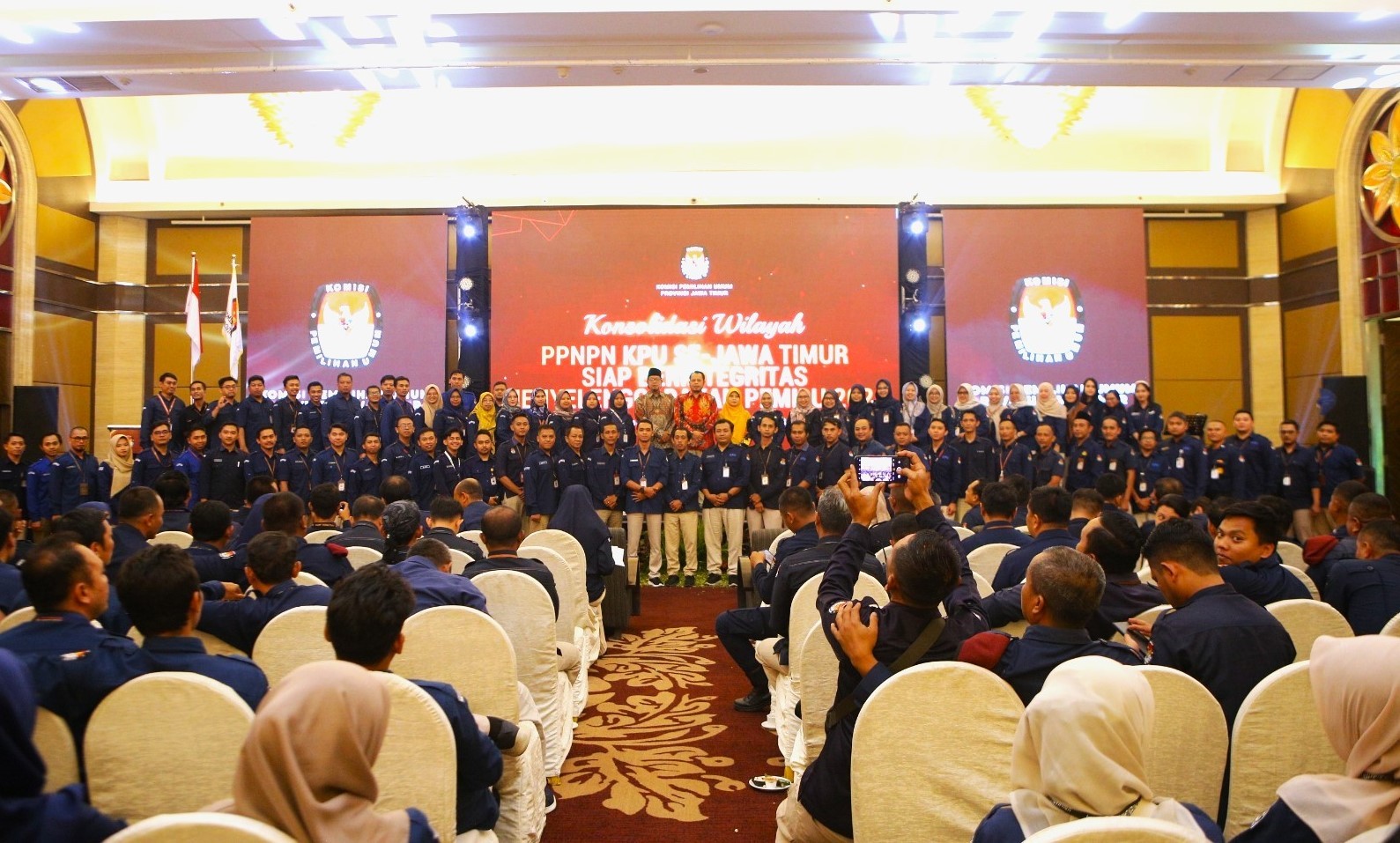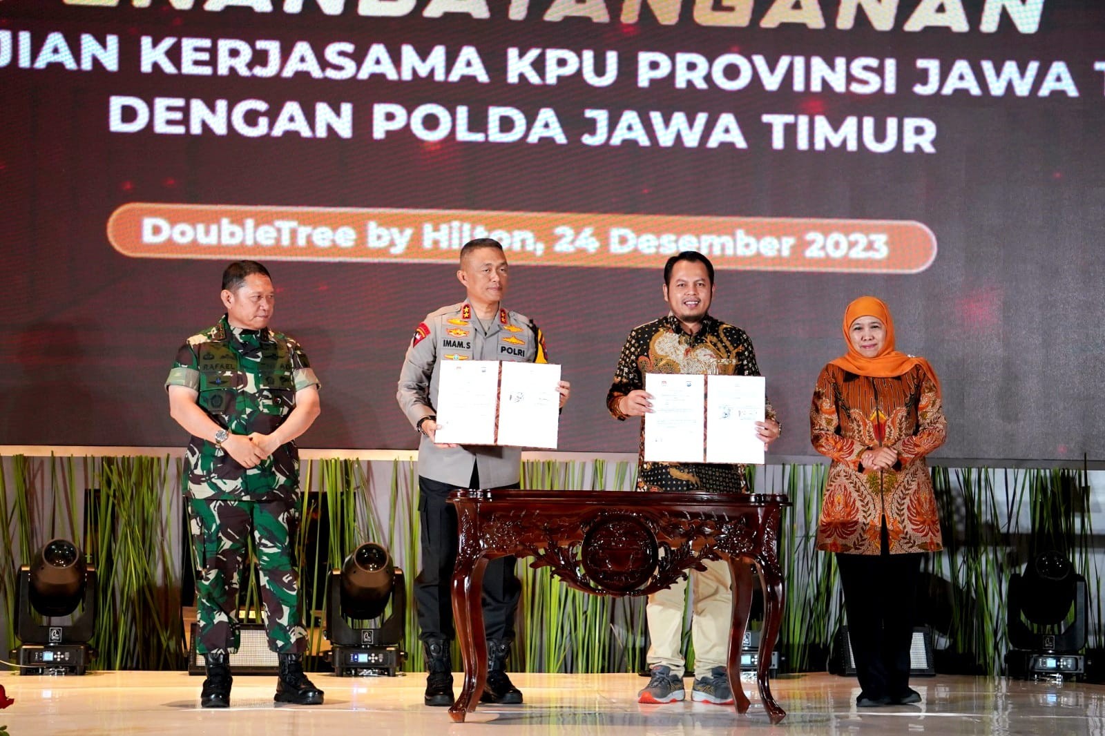 Surabaya, jatim.kpu.go.id- Gubernur Jawa Timur Khofifah Indar Parawansa hadir membuka Rapat Pimpinan dan Konsolidasi Wilayah Dalam Penyelenggaraan Pemilu Tahun 2024 KPU Provinsi dan KPU Kabupaten/Kota se Jawa Timur di Surabaya pada Minggu, 24 Desember 2023. Khofifah tiba di Hotel DoubleTree by Hilton Surabaya pada pukul 20.00 WIB bersama Kepala Kepolisian Daerah Jawa Timur (Kapolda Jatim) Irjen Pol Drs. Imam Sugianto dan Pangdam V Brawijaya Mayjen TNI Rafael Granada Baay. Disambut langsung oleh Ketua, Anggota, dan Sekretaris KPU Provinsi Jawa Timur (KPU Jatim) Mengawali serangkaian acara, Gunernur beserta rombongan memasuki ruangan dan secara langsung menyerahkan santunan kepada sejumlah anak yatim. Sementara prosesi pembukaan Rapim secara simbolis ditandai dengan penusukan balon dan dilanjutkan dengan penyerahan cinderamata. Pada kesempatan tersebut pula, Khofifah secara langsung menyaksikan penandatanganan Perjanjian Kerjasama antara KPU Jatim dengan Polda Jatim tentang Sinergisitas Pelaksanaan Tugas dan Fungsi dalam Penyelenggaraan Pemilu dan Pilkada Serentak Tahun 2024 di Wilayah Jawa Timur. Di hadapan Gubernur, Ketua KPU Jatim dalam sambutannya menyampaikan apresiasi, sebab belum lama ini KPU Jatim melakukan penandatanganan Naskah Perjanjian Hibah Daerah (DPHD) untuk Pilkada Tahun 2024. "Alhamdulillah, mungkin Jawa Timur satu-satunya provinsi yang pencairan anggarannya tidak hanya 40 persen, tapi 58 persen," tutur Anam. Hal tersebut menurut Anam menjadi bukti komitmen untuk terus mendukung demokrasi di Jawa Timur. "Karena dalam demokrasi, pemimpin yang berkyalitas dihasilkan oleh Pemilu yang berkualitas. Sementara Pemilu yang berkualitas dihasilkan oleh Penyelenggara yang berkualitas pula," terangnya. Masih Anam, dalam kesempatan tersebut Ia juga melaporkan perkembangan sejumlah tahapan Pemilu di Jawa Timur. KPU Jatim telah menetapkan 31.402.838 pemilih, yang merupakan jumlah Daftar Pemilih Tetap (DPT) terbesar setelah Jawa Barat. Selain itu, baru saja, KPU Jatim juga mendapatkan predikat sebagai Unit Penyelenggara Pelayanan Publik kategori "Pelayanan Prima" dari Kementrian Pendayagunaan Aparatur Negara Reformasi Birokrasi (PAN-RB). Sementara terkait logistik, saat ini sudah mencapai 90 persen dan ada di gudang KPU Kabupaten/Kota. Anam menyampaikan 15 Januari 2024 seluruh logistik dipastikan selesai. Dengan prioritas KPU Sumenep, karena pengiriman menggunakan kapal laut. Berkaitan dengan kesiapan SDM penyelenggara, saat ini KPU Jatim juga tengah melaksanakan tahapan rekrutmen Anggota Kelompok Penyelenggara Pemungutan Suara (KPPS). Menanggapi hal tersebut, Rafael Granada menyatakan siap memberikan dukungan penuh terhadap pengamanan logistik. Dukungan tersebut, juga datang dari Kapolda Jatim Sugianto. "Terlebih saat ini juga KPU Jatim dan Polda Jatim sudah membangun kerjasama atas tindak lanjut MoU yang dilakukan KPU dengan Polri," tutup Imam. Rapim diikuti oleh 38 KPU Kabupaten/Kota, masing-masing terdiri Ketua, Anggota, dan Sekretaris. Sementara dari KPU Jatim hadir selain Anam, Anggota Miftahur Rozaq, Gogot Cahyo Baskoro, Insan Qoriawan, Rochani, dan Nurul Amalia, Sekretaris Nanik Karsini, beserta Pejabat Struktural dan Fungsional.* (AFN/Fto. AA)