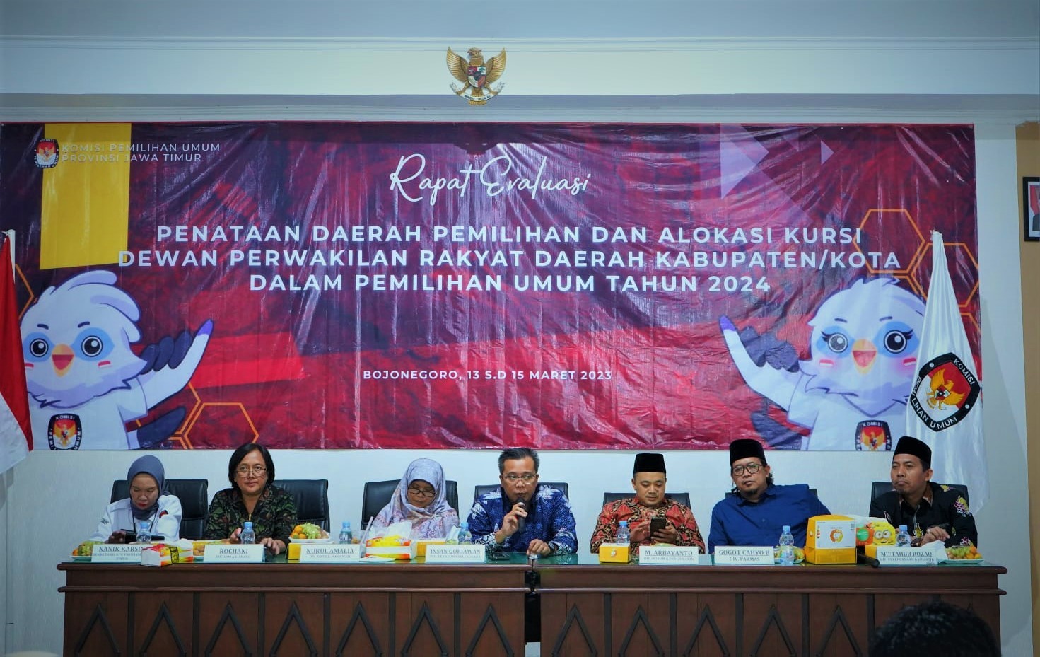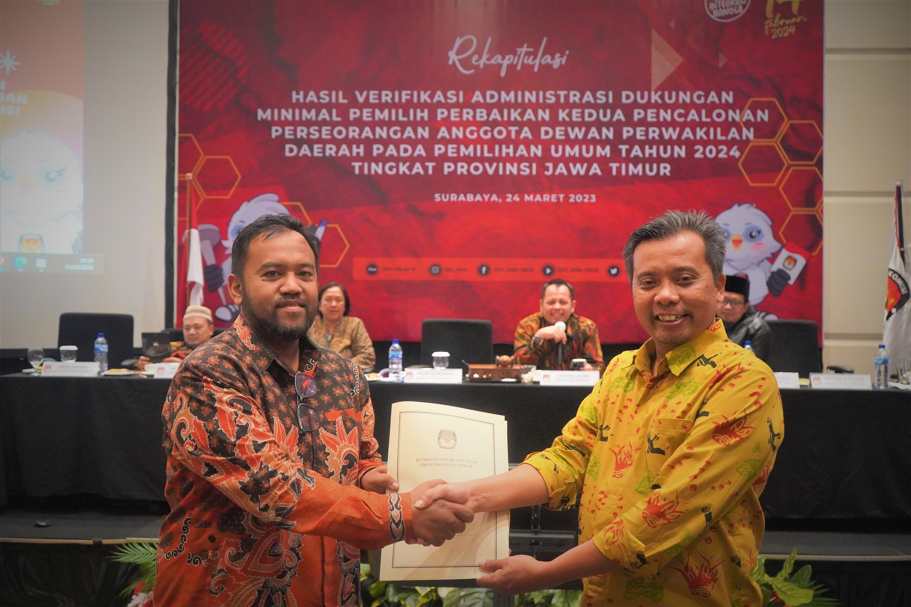 Surabaya, jatim.kpu.go.id- Sebelas dari empat belas Bakal Calon Anggota Dewan Perwakilan Daerah (DPD) yang melakukan verifikasi administrasi (vermin) dukungan minimal pemilih perbaikan kedua, telah dinyatakan Memenuhi Syarat (MS) minimal dukungan dan sebaran berdasarkan hasil Rapat Pleno Rekapitulasi Tingkat Provinsi. Rapat Pleno Rekapitulasi Vermin Dukungan Minimal Pemilih Perbaikan Kedua Pencalonan Perseorangan Anggota DPD pada Pemilu Tahun 2024 Tingkat Provinsi Jawa Timur digelar pada Jumat, 24 Maret 2023, mulai pukul 15.10 sampai sekitar 20.30 WIB. Bertempat di ARTOTEL TS Suites Surabaya, Jl. Hayam Wuruk Nomor 6 Surabaya. Dengan melibatkan empat belas (14) Bakal Calon Anggota DPD atau Liaison Officer (LO), Bawaslu Provinsi Jawa Timur, Divisi Teknis Penyelenggaraan dan Kasubbag Teknis Penyelenggaraan Pemilu dari 38 KPU Kabupaten/Kota di Jawa Timur. Sementara dari jajaran Komisioner KPU Jatim hadir Choirul Anam, Insan Qoriawan, Gogot Cahyo Baskoro, Muhammad Arbayanto, Rochani, dan Miftahur Rozaq. Serta Sekretaris, Nanik Karsini, Kabag Teknis Penyelenggaraan Pemilu; Partisipasi dan Hubungan Masyarakat (Tekmas), Yulyani Dewi, Kasubbag Teknis Penyelenggaraan Pemilu, Eddy Prayitno, dan staf terkait. Ketua KPU Jatim, Choirul Anam saat membuka rapat pleno rekapitulasi menerangkan bahwa KPU Provinsi melakukan rekapitulasi hasil vermin perbaikan kedua setelah menerima berita acara hasil verifikasi administrasi perbaikan kedua kabupaten/kota. “Pada Rapat Pleno Rekapitulasi Vermin Dukungan Minimal Pemilih Perbaikan Kedua, KPU Provinsi menghitung dukungan yang dinyatakan tidak memenuhi syarat, menyampaikan berita acara, menyusun rekapitulasi hasil verifikasi administrasi perbaikan kedua, menuangkan hasil rekapitulasi hasil vermin perbaikan kedua, mengunggah formulir ke dalam Silon (Sistem Informasi Pencalonan -red)dan menyampaikan pada bacalon DPD serta Bawaslu Provinsi melalui Silon,” papar pria yang juga akrab disapa Cak Anam ini. Lebih lanjut, Insan Qoriawan selaku Divisi Teknis Penyelenggaraan, ditemui usai melaksanakan rekapitulasi, memberikan keterangan jika ada sebelas (11) Bakal Calon Anggota DPD yang dinyatakan Memenuhi Syarat (MS) minimal dukungan dan sebarannya. “Yakni Adilla Azis, Ayub Khan, Bambang Harianto, Catur Rudi Utanto, Doddy Dwi Nugroho, Emilia Contessa, Erlytha Dwi A Siregar, Khoirul Arif Rohman, Kunjung wahyudi, Lia Istifhama, serta Mohammad Trijanto,” katanya. Kesebelas Bacalon DPD yang dinyatakan MS, berikutnya malam ini juga, masih di tempat yang sama, melakukan penentuan sampel dukungan Bacalon DPD. Penentuan sampel, sebagaimana Peraturan KPU Nomor 10 Tahun 2022 tentang Pencalonan Perseorangan Peserta Pemilu Anggota DPD dengan menggunakan Silon. Adapun metode yang dipakai menurut Insan, dengan metode Krejcie dan Morgan untuk setiap wilayah kabupaten/kota. “Mekanisme yang ditempuh untuk menentukan sampel diantaranya menentukan jumlah sampel, interval, mengurutkan dukungan yang akan dicuplik untuk sampel, menentukan nomor awal sampel, serta mencuplik sampel. Seluruh mekanisme ini dikerjakan oleh KPU Provinsi, kecuali untuk penentuan nomor awal sampel dilakukan oleh Bacalon,” jelas Insan. Usai dilakukan penentuan sampel dukungan Bacalon, kesebelas Bacalon akan diverifikasi faktual kedua, mulai Minggu, 26 Maret – Sabtu, 8 April 2023. Terakhir, Anggota Bawaslu Provinsi Jawa Timur, Purnomo Satri Pringgodigdo berpesan pada kesebelas Bacalon atau LO, agar dalam tahapan verfak perbaikan kedua bisa memaksimalkan beberapa mekanisme verfak seperti video call dan mengumpulkan video. “Selain itu, LO di masing-masing kabupaten/kota juga melakukan koordinasi yang baik dengan KPU Kabupaten/Kota,” pungkasnya. Perlu diketahui, tiga (3) Bacalon DPD yang tidak memenuhi syarat (TMS) minimal dukungan pemilih dan sebaran ialah ‘Aisyah Aleena Maheswari Novinda, Narto SK Dentopuro, dan Siti Rafika Hardhiansari.*** (AA)