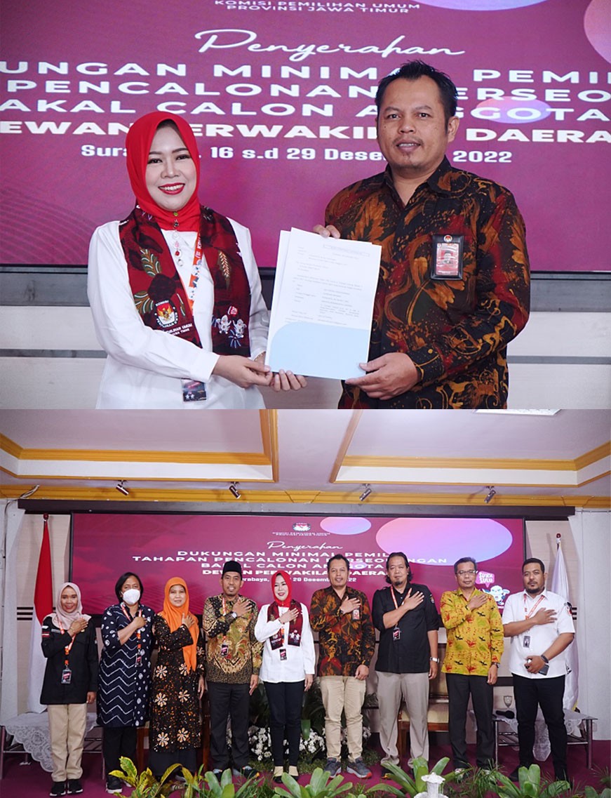 Para Bakal Calon disambut oleh Sekretaris KPU Jatim Nanik Karsini dan diterima langsung oleh Ketua Choirul Anam dan Anggota KPU Jatim Gogot Cahyo Baskoro, Miftahur Rozaq, Nurul Amalia, Insan Qoriawan, dan Rochani. Turut hadir juga sepuluh orang perwakilan Badan Pengawas Pemilu Provinsi Jawa Timur (Bawaslu Jatim) untuk menyaksikan rangkaian penyerahan dokumen syarat dukungan minimal pemilih ini.