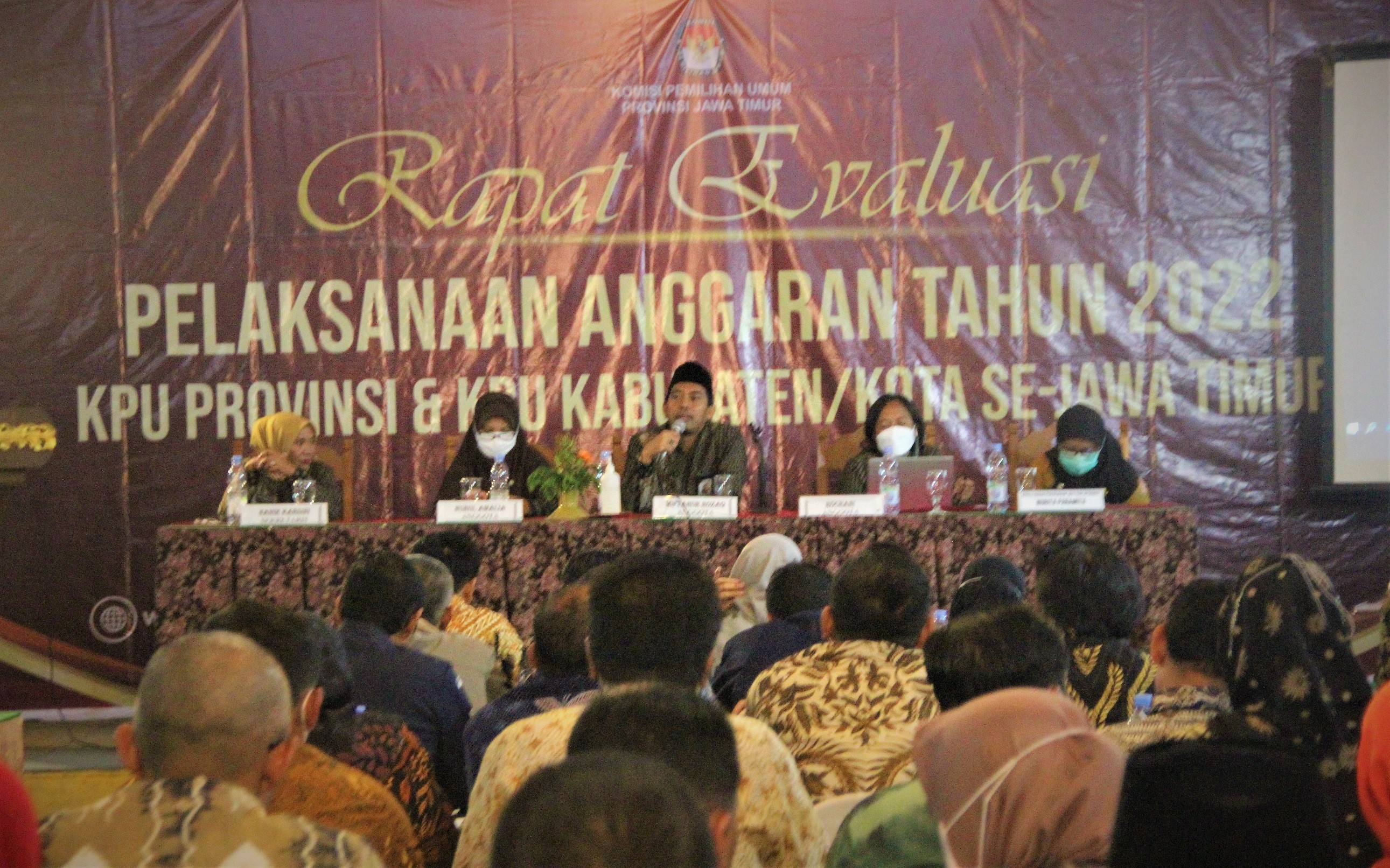 Mojokerto, jatim.kpu.go.id- Guna mewujudkan target realisasi anggaran 95%-98%, Komisi Pemilihan Umum Provinsi Jawa Timur (KPU Jatim) bersama KPU Kabupaten/Kota se-Jawa Timur bersama-sama melakukan evaluasi dan menyusun strategi pelaksanaan anggaran tahun 2022 pada Selasa-Kamis, tanggal 22-24 November 2022, mulai pukul 16.00 WIB-selesai. Kegiatan ini dikemas dalam Rapat Evaluasi Pelaksanaan Anggaran Tahun 2022 KPU Provinsi dan KPU Kabupaten/Kota se-Jawa Timur, bertempat di Royal Trawas Hotel & Cottages, jalan Raya Slepi Trawas Mojokerto. Diikuti Ketua, Divisi Perencanaan; Data dan Informasi, Sekretaris, serta Kepala Subbagian Perencanaan;Data dan Informasi (Rendatin) KPU Kabupaten/Kota se-Jawa Timur. Divisi Perencanaan dan Logistik KPU Jatim, Miftahur Rozaq mengungkapkan kegiatan kali ini semacam reviu anggaran tahun 2022, yang selanjutnya akan bersama-sama menentukan langkah-langkah yang perlu diambil dalam menghadapi akhir tahun. “Waktu kita menuju akhir tahun kurang lebih tinggal 40 hari kedepan. Masih sangat mungkin kita melakukan percepatan realisasi program dan anggaran agar bisa mencapai target realisasi anggaran 95%-98%,” kata Rozaq dalam sambutannya. Ia berharap juga KPU Kabupaten/Kota dalam melakukan realisasi program dan anggaran, dapat memanajemen dinamika yang ada. Sebelumnya, Kepala Bagian Rendatin KPU Jatim, Nurita Paramita sempat menyampaikan bahwa target realisasi anggaran 95%-98% ini merupakan target nasional yang ditentukan oleh Sekretaris Jenderal KPU, Bernad Dermawan Sutrisno. “Selanjutnya, untuk membantu KPU Provinsi dan Kabupaten/Kota dalam menyusun strategi pelaksanaan anggaran 2022, KPU Jatim pada hari kedua mengundang pemateri dari Kantor Wilayah Direktorat Jenderal Pajak Provinsi Jawa Timur. Pemateri ini akan mensosialisasikan langkah-langkah akhir tahun anggaran 2022,” terangnya. Lebih lanjut, juga dilakukan evaluasi pelaksanaan anggaran tahun 2022 KPU Provinsi dan Kabupaten/Kota. Di hari terakhir, akan ada sesi paparan terkait pelayanan publik sebagai upaya peningkatan kualitas layanan menuju standar pelayanan publik yang berkualitas dalam penyelenggaraan Pemilu 2024. Turut mengikuti rapat evaluasi dari KPU Jatim, diantaranya Komisioner, Miftahur Rozaq; Gogot Cahyo Baskoro; Rochani; Nurul Amalia, Sekretaris, Nanik Karsini, Kepala Bagian Rendatin, Nurita Paramita, beserta jajaran staf yang membidangi.*** (AA/Fto.Panitia)