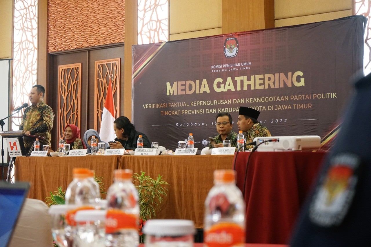 Surabaya, jatim.kpu.go.id- Komisi Pemilihan Umum Provinsi Jawa Timur (KPU Jatim) menjelaskan tahapan verifikasi faktual kepengurusan dan keanggotaan partai politik dalam penyelenggaraan Pemilu Tahun 2024 kepada sejumlah insan media. Penjelasan tersebut disampaikan melalui kegiatan media gathering yang digelar pada Selasa, 18 Oktober 2022. Bertempat di Swiss Belinn Hotel Surabaya, media gathering dihadiri sebanyak 50 perwakilan media di Jawa Timur. Ketua KPU Jatim Choirul Anam dalam sambutannya menyampaikan tahapan krusial penyelenggaraan pemilu dapat dilihat melalui tiga aspek utama. "Pertama tahapan yang mengatur peserta pemilu, kedua mengatur penyelenggara, dan ketiga mengatur pemilih," kata Anam. Kaitannya dengan peserta pemilu, saat ini KPU tengah melaksanakan tahapan verifikasi faktual kepengurusan dan keanggotaan partai politik calon peserta pemilu tahun 2024. "Tahapan ini sudah kami mulai kemarin 15 Oktober 2022 hingga 4 November 2022. Dan akan dilanjutkan sampai dengan penetapan peserta pemilu pada 14 Desember," jelas Anam. Selanjutnya berkaitan dengan penyelenggara, akan dilakukan rekrutmen Badan Adhoc yang kemungkinan dimulai bulan November mendatang, sembari menunggu Peraturan KPU turun. "Di Jawa Timur kami akan merekrut Panitia Pemilihan Kecamatan (PPK) sebanyak 5 kali 666 kecamatan, sedangkan untuk Panitia Pemungutan Suara (PPS) sejumlah 3 kali 8.496 kelurahan/desa," terang Anam. Ketiga, tahapan yang berkaitan dengan pemilih. Pemutakhiran data pemilih ini dimulai pada 14 Oktober 2022 dan dilakukan kurang lebih selama enam bulan. Tahapan ini memakan waktu cukup panjang, dari awal sampai dengan bisa ditetapkan sebagai DPT. Masih menurut Anam, forum media gathering ini merupakan bagian langkah KPU untuk bekerja lebih terbuka. "Kami punya tugas konstitusional untuk menyampaikan informasi kepada masyarakat secara masif. Tentu hal ini membutuhkan bantuan kawan-kawan media," tutur Anam. Dikatakan pula, KPU Jatim saat ini sudah mulai mendesain publikasi informasi dengan baik. Artinya setiap informasi yang kita publish juga dapat dikonsumsi secara cepat dan aktual oleh media. Perlu diketahui, Rangkaian media ghatering ini akan berlangsung selama dua hari sampai dengan Rabu, 19 Oktober 2022. Dimulai pukul 16.30 acara pembukaan berlangsung selama kurang lebih satu jam. Pada sesi kedua, akan disampaikan materi khusus tahapan verifikasi faktual kepengurusan dan keanggotaan partai politik peserta pemilu dengan dipandu langsung Divisi Teknis Penyelenggaran, Insan Qorriawan. Adapun hari kedua akan digelar diskusi mengenai peran media dalam penyelenggaraan pemilu 2024 dengan narasumber Divisi Sosialisasi, Pendidikan Pemilih dan Partisipasi Masyarakat, Gogot Cahyo Baskoro. Dilanjutkan dengan diskusi grop terarah merumuskan peran ideal media dalam pemilu 2024. Turut hadir dalam pembukaan, Anggota Gogot Cahyo Baskoro, Insan Qoriawan, Miftahur Rozaq, Nurul Amalia. Sekretaris Nanik Karsini, Kabag Teknis dan Hubungan Partisipasi Masyarakat, Kasubbag Teknis Penyelenggaraan dan Staf.*** (afn/Fto. Sekti)