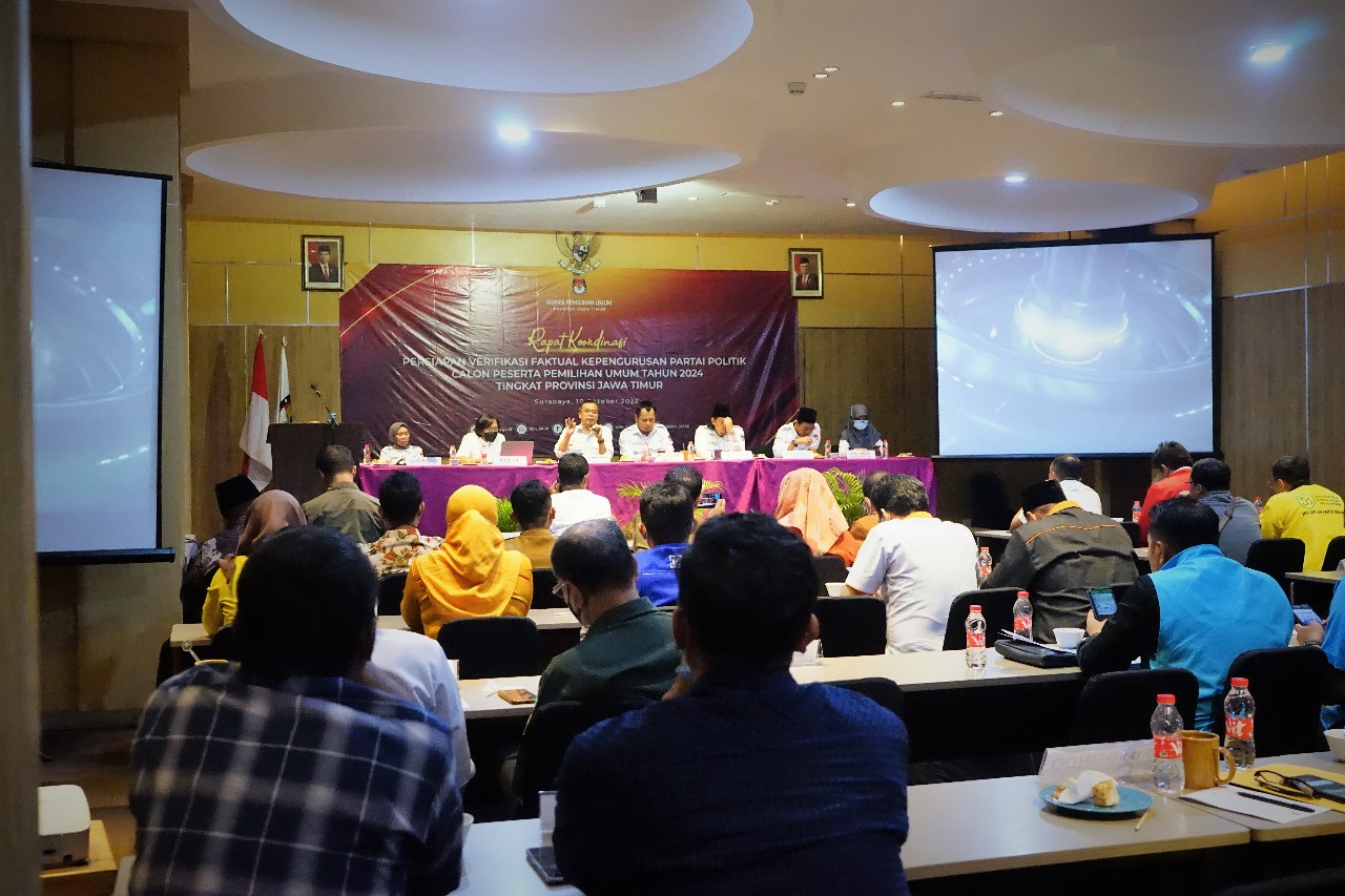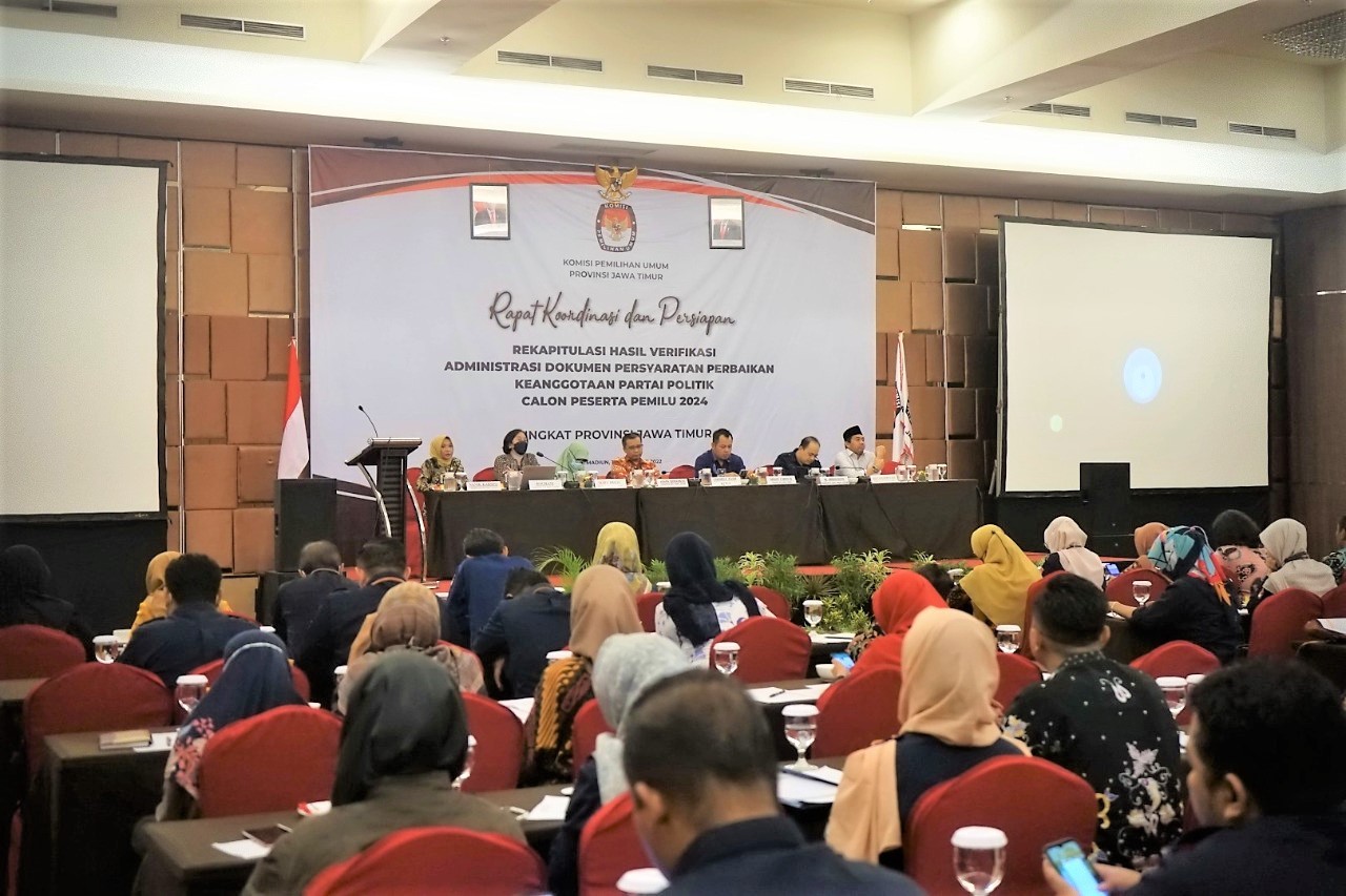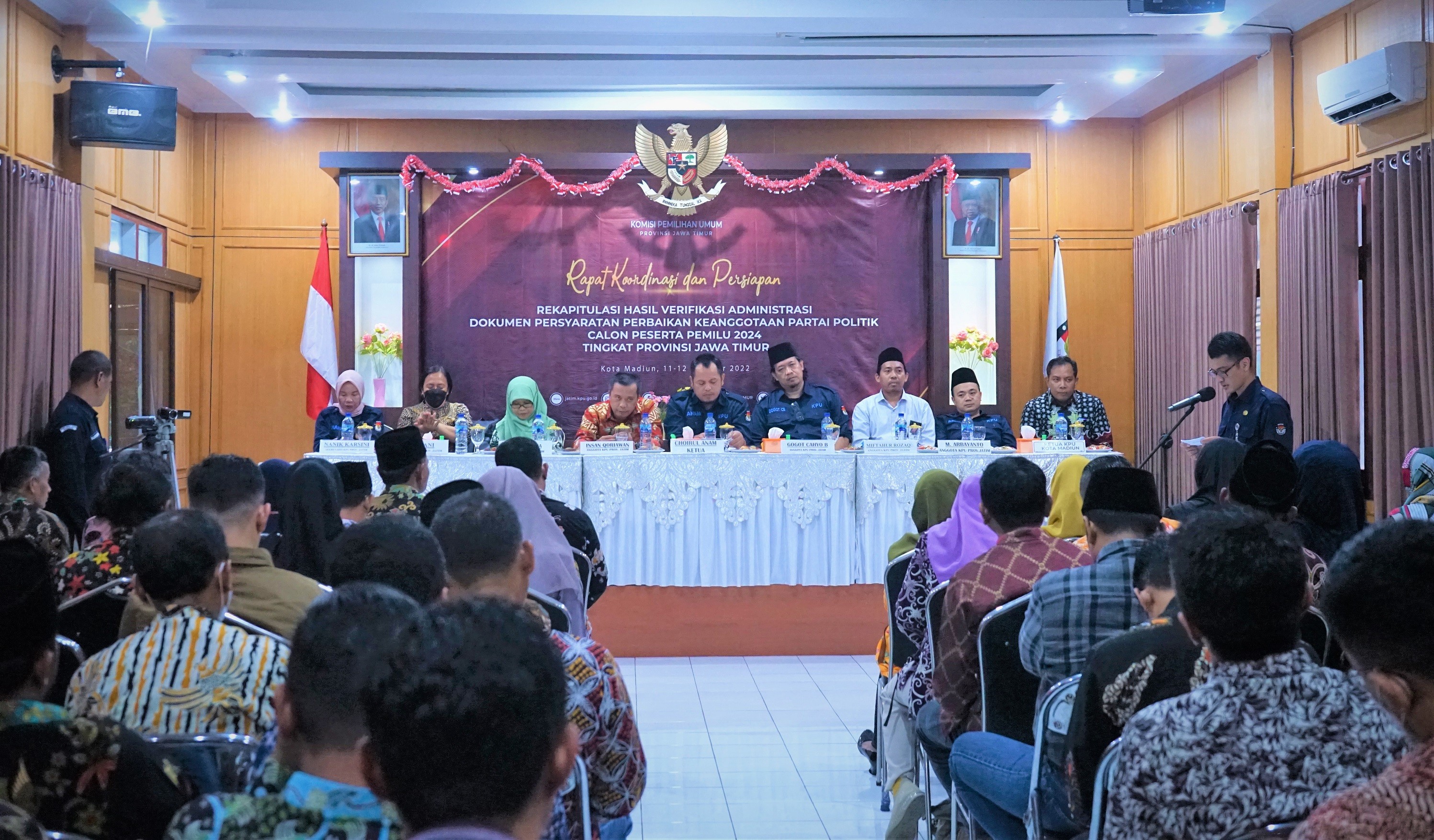Madiun, jatim.kpu.go.id- Persiapkan verifikasi faktual (verfak) di tingkatan kabupaten/kota, Komisi Pemilihan Umum Provinsi Jawa Timur (KPU Jatim) mengajak 228 orang jajaran penyelenggara di wilayahnya untuk melakukan mitigasi permasalahan pada Selasa-Rabu, 11-12 Oktober 2022. Kegiatan yang bertempat di kantor KPU Kota Madiun, jalan Mobilisasi Pelajar Nomor 2 Kota Madiun ini, dikemas dalam Rapat Koordinasi (Rakor) dan Persiapan Rekapitulasi Hasil Verifikasi Administrasi (Vermin) Dokumen Persyaratan Perbaikan Keanggotaan Partai Politik (Parpol) Calon Peserta Pemilu Tahun 2024 Tingkat Provinsi Jawa Timur. Karena memang pada rangkaian acara ini juga berlangsung persiapan rekapitulasi hasil vermin dokumen persyaratan perbaikan keanggotaan parpol calon peserta Pemilu 2024 tingkat provinsi. Serta pada hari kedua juga akan dilaksanakan penyampaian rekapitulasi hasil vermin dokumen persyaratan perbaikan keanggotaan parpol calon peserta Pemilu 2024 tingkat provinsi. Peserta rakor terdiri dari Ketua, Divisi Teknis Penyelenggaraan Pemilu, Divisi Sosialsiasi; Pendidikan Pemilih; Partisipasi Masyarakat dan SDM, Sekretaris, Kasubag Tekmas, dan admin/Verifikator Sipol dari 38 KPU Kabupaten/Kota di Jawa Timur. Sedangkan dari KPU Jatim hadir Ketua, Choirul Anam dan Anggota, Gogot Cahyo Baskoro, Muhammad Arbayanto, Insan Qoriawan, Rochani, Miftahur Rozaq, Nurul Amalia. Sementara dari jajaran sekretariat turut hadir Sekretaris, Nanik Karsini, Kabag Teknis Penyelenggaraan Pemilu; Partisipasi dan Hubungan Masyarakat (Tekmas), Popong Anjarseno, Kasubbag Teknis Penyelenggaraan Pemilu, Eddy Prayitno, Kasubbag Parmas, Prahastiwi serta staf bagian Tekmas. Ketua KPU Jatim, Choirul Anam saat membuka rakor menyampaikan bahwa mitigasi permasalahan jelang verfak menjadi sangat penting. “Dari hitungan saya, rata-rata setiap KPU Kabupaten/Kota ada 3000 orang yang harus dilakukan proses faktual. Proses ini wajib dilaksanakan dalam 21 hari, yakni mulai tanggal 15 Oktober sampai dengan 4 November 2022. Dan KPU wajib mendatangi satu per satu, jadi kalau dibagi 21 hari, setiap harinya kita akan mendatangi 142 orang,” papar Anam. Tentu menurut Anam, ini bukanlah pekerjaan yang ringan, tapi cukup berat karena dilaksanakan dalam waktu yang singkat. “Maka perlu manajemen yang baik untuk bisa mencapai target melakukan verfak sebanyak itu. Untuk itu, pada kesempatan ini sengaja mengundang Kawan-kawan kabupaten/kota untuk melakukan mitigasi permasalahan verfak agar mampu memanage kegiatan verfak mulai dari sekarang. Kita perlu merumuskan mekanisme yang cukup efektif dan efisien agar proses verfak yang dilakukan dengan sumber daya manusia yang terbatas dan waktu singkat ini berjalan dengan baik, efektif dan efisien,” tegas Ketua KPU Jatim mengakhiri sambutannya.*** (AA/Fto.Sekti)