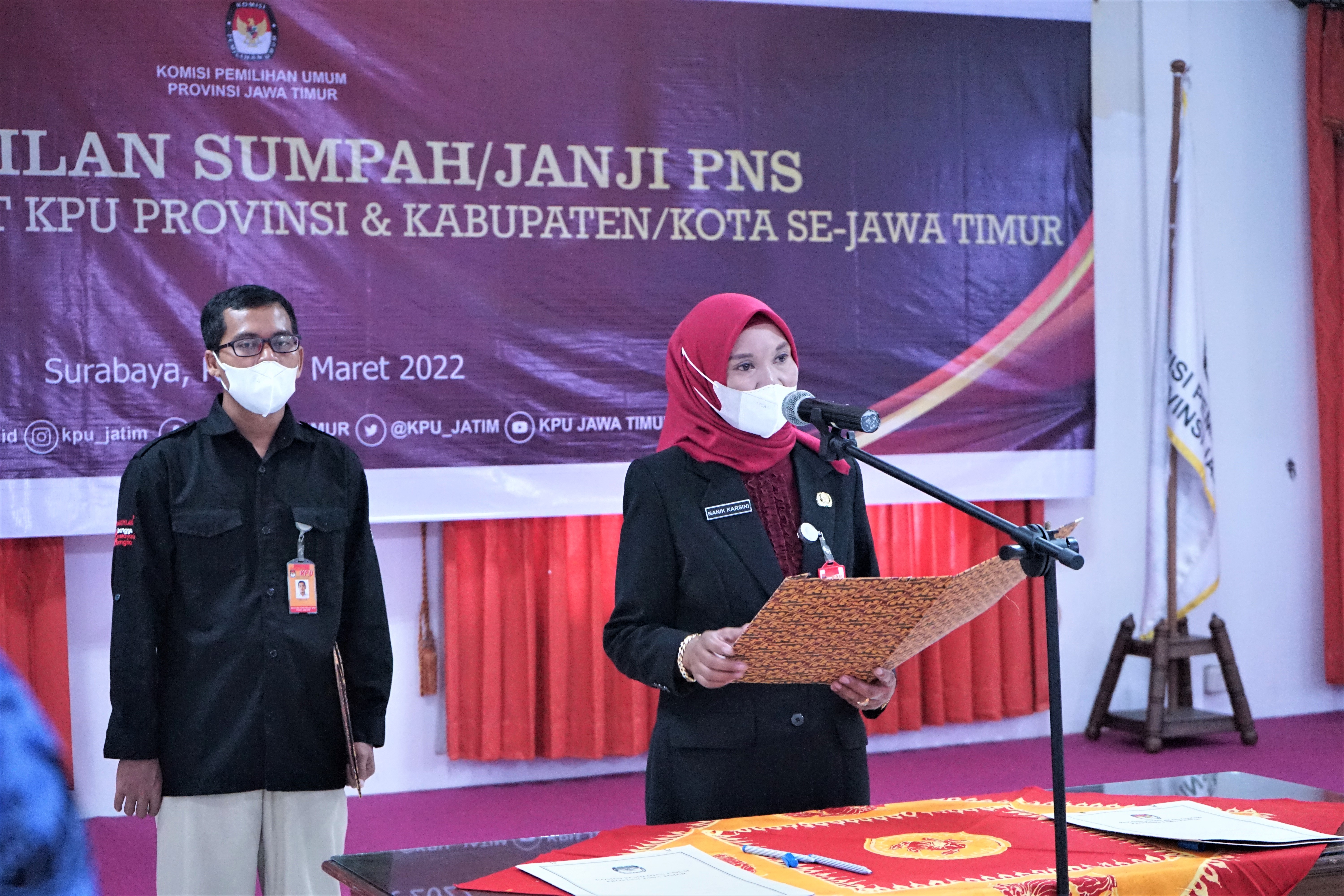 Surabaya, jatim.kpu.go.id- Sekretaris KPU Provinsi Jawa Timur (KPU Jatim), Nanik Karsini melantik 155 Kepala Sub Bagian (Kasubbag) di lingkungan Sekretariat KPU Provinsi dan Kabupaten/ Kota se-Jawa Timur baik secara daring maupun luring hari ini, Jum’at (11/3). Momentum ini merupakan sebuah langkah penataan dan pembenahan organisasi Sekretariat Penyelenggara Pemilu. Sebelumnya Surat Dinas Sekjen KPU Nomor 536/SDM.05.5-SD/04/2022 menjadi dasar pendelegasian wewenang pelaksanaan Pelantikan dan Pengambilan Sumpah Janji Jabatan Kasubbag pada Sekretariat KPU Provinsi/ KIP Aceh dan Sekretariat KPU Kabupaten/ Kota oleh Sekjen KPU kepada Sekretaris KPU Provinsi. Dengan demikian, pelantikan Kasubbag di lingkungan Sekretariat KPU Provinsi dan Kabupaten/ Kota se-Jawa Timur hari ini dilakukan oleh Sekretaris KPU Jatim, Nanik Karsini. Pada kesempatan ini, Nanik membacakan naskah sambutan Sekjen KPU, Bernad Dermawan Sutrisno. Di dalam sambutan tersebut Nanik menyampaikan bahwa Pelantikan dan Pengambilan Sumpah/ Janji pada hari ini merupakan bagian dari pelaksanaan Peraturan KPU Nomor 14 Tahun 2020 secara tuntas. “Pelantikan secara serentak ini melibatkan 2121 Kasubbag pada Sekretariat KPU Provinsi dan KPU Kabupaten/ Kota se-Indonesia. Di Jawa Timur sendiri ada 155 orang Kasubbag yang dilantik. Momentum ini bagi Kita menjadi sebuah langkah penataan dan pembenahan organisasi Sekretariat Penyelenggara Pemilu,” ungkapnya (11/3/2022). Penataan Organisasi dan Tata Kerja Kesekretariatan KPU dikatakan Nanik akan memperluas dukungan pada tugas dan fungsi pelayanan agar lebih kompetitif, inovatif, produktif serta akuntabel dalam mempersiapkan penyelenggaraan Pemilu dan Pemilihan Serentak Tahun 2024. Berikutnya, menurut Nanik tantangan kedepan bagi Kasubbag terlantik tidaklah mudah. “Maka dari itu, dalam menjalankan tugas kedepan Kita harus melaksanakan konsolidasi untuk menjaga soliditas, koordinasi dengan berbagai stakeholders, serta meningkatkan kompetensi,” jelas Sekretaris KPU Jatim. Turut mengikuti pelantikan secara luring di KPU Jatim yakni para Kasubbag dari KPU Kota Surabaya, para Kasubbag dari KPU Kabupaten Mojokerto, dan para Kasubbag dari KPU Kabupaten Bojonegoro. Hadir pula pada kesempatan ini Ketua dan Anggota KPU Jatim. Sementara tamu undangan berasal dari perwakilan Komisioner KPU Kota Surabaya, KPU Kabupaten Mojokerto, dan KPU Kabupaten Bojonegoro. (AA/ Foto AA)