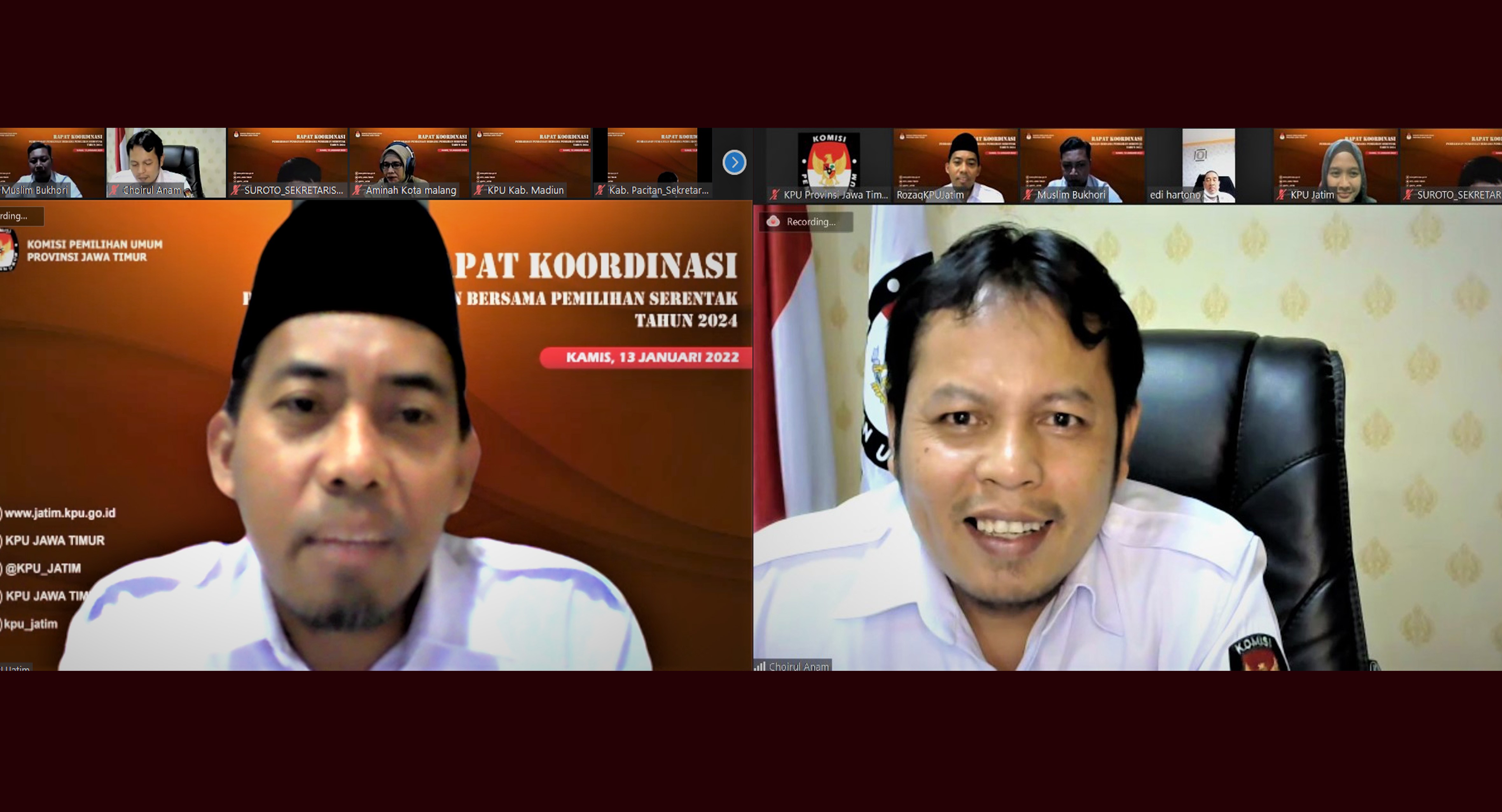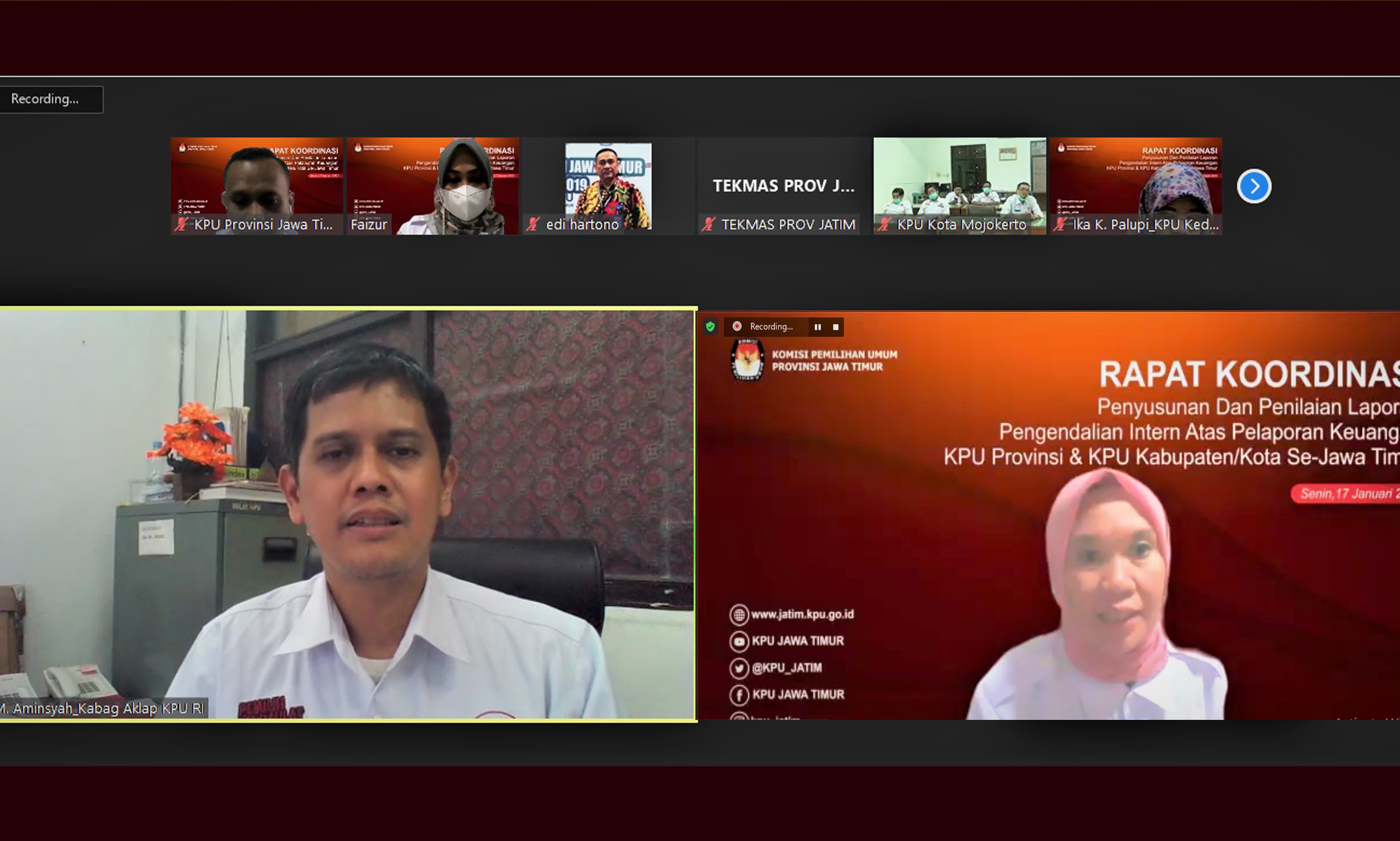 Surabaya, jatim.kpu.go.id- Tingkatkan akuntabilitas pelaporan keuangan, Komisi Pemilihan Umum Provinsi Jawa Timur (KPU Jatim) menggelar Rapat Koordinasi (rakor) Penyusunan dan Penilaian Laporan Pengendalian Intern atas Pelaporan Keuangan (PIPK) bersama 38 KPU Kabupaten/ Kota se-Jawa Timur hari ini, Senin (17/1). Sekretaris KPU Jatim, Nanik Karsini dalam sambutannya menyampaikan bahwa Kegiatan ini diselenggarakan sebagai tindak lanjut dari Surat Sekretariat Jenderal KPU Republik Indonesia Nomor 3508/KU.03.2/2021. “Surat tersebut terkait Pelaksanaan Pengendalian Intern atas Pelaporan Keuangan (PIPK) untuk dapat disosialisasikan secara daring kepada seluruh satker di KPU Kabupaten/ Kota di Jawa Timur,” jelas Nanik (17/1/2022). Senada dengan yang disampaikan Nanik, Kepala Bagian Akuntansi dan Pelaporan Keuangan Pemerintah Biro Keuangan KPU RI, M. Aminsyah dalam pengantarnya berharap PIPK dapat menyajikan laporan keuangan yang disusun sesuai dengan standar pemerintah untuk memenuhi empat (4) opini Badan Pemeriksa Keuangan (BPK). “Empat (4) opini tersebut diantaranya laporan keuangan sesuai standar Akuntansi Pemerintah, kecukupan pengungkapan, kepatuhan terhadap perundang-undangan, serta efektivitas Sistem Pengendalian Intern Pemerintah (SPIP),” papar Amin. Pada forum rakor kali ini, KPU Jatim menghadirkan narasumber Kepala Subbagian Akuntansi dan Pelaporan Keuangan Pemerintah Biro Keuangan KPU RI, Dwi Rosmala. Dwi menyebutkan PIPK dilaksanakan oleh setiap Entitas Akuntansi dan Entitas Pelaporan Penyusunan Lembaga Kebijakan Pengadaan Barang/ Jasa (LKPP). “PIPK diterapkan pada tingkat entitas pelaporan penyusunan LKPP bertanggung jawab untuk untuk mengelola, memelihara, dan secara berkala memutakhirkan dokumentasi penerapan PIPK,” terang Dwi. Dokumentasi yang dimaksud mencakup rancangan penerapan, dan mekanisme evaluasi pengendalian intern atas pelaporan keuangan yang tercermin dalam Petunjuk Teknis (Juknis), Standar Operasional Prosedure (SOP), SOP turunan yang dikeluarkan oleh KPU Provinsi, kebijakan administratif, pedoman akuntansi, serta pedoman lainnya. Perlu diketahui, rakor yang digelar secara virtual ini dihadiri oleh Sekretaris, Kasubbag Keuangan; Umum; dan Logistik, Subkoordinator Teknis dan Hupmas, Subkoordinator Program; Data dan Informasi, Subkoordinator Hukum, Bendahara, Operator Sistem Akuntansi Instansi Berbasis Akrual (SAIBA), serta Operator Sistem Informasi Manajemen dan Akuntansi Barang Milik Negara (SIMAK-BMN) dari 38 KPU Kabupaten/ Kota se-Jawa Timur. (AFN/ ed. Red)