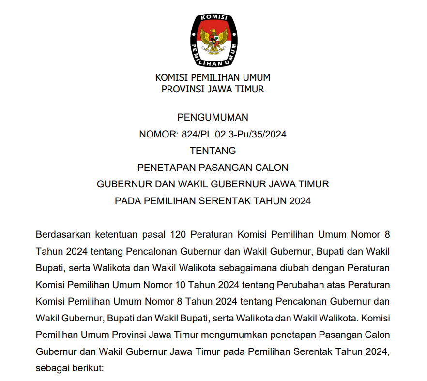 Pengumuman Nomor 824/PL.02.3-Pu/35/2024 Tentang Penetapan Pasangan Calon Gubernur dan Wakil Gubernur Jawa Timur pada Pemilihan Serentak Tahun 2024 Unduh di Sini