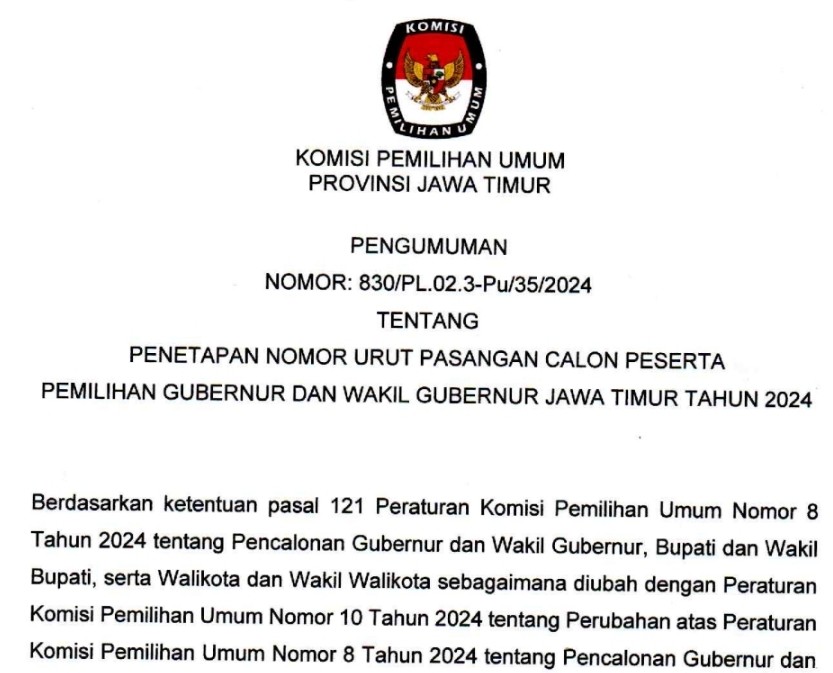 Pengumuman Nomor 830/PL.02.3-Pu/35/2024 Tentang Penetapan Nomot Urut Pasangan Calon Peserta Pemilihan Gubernur dan Wakil Gubernur Jawa Timur Tahun 2024 Unduh di Sini
