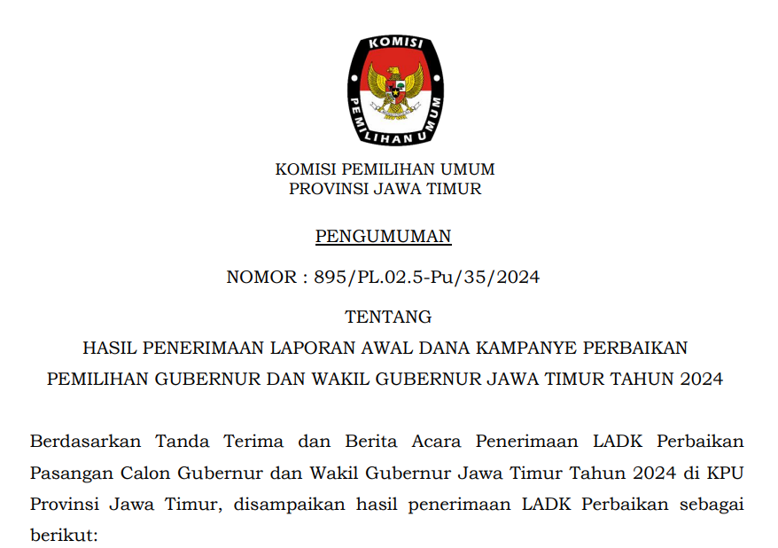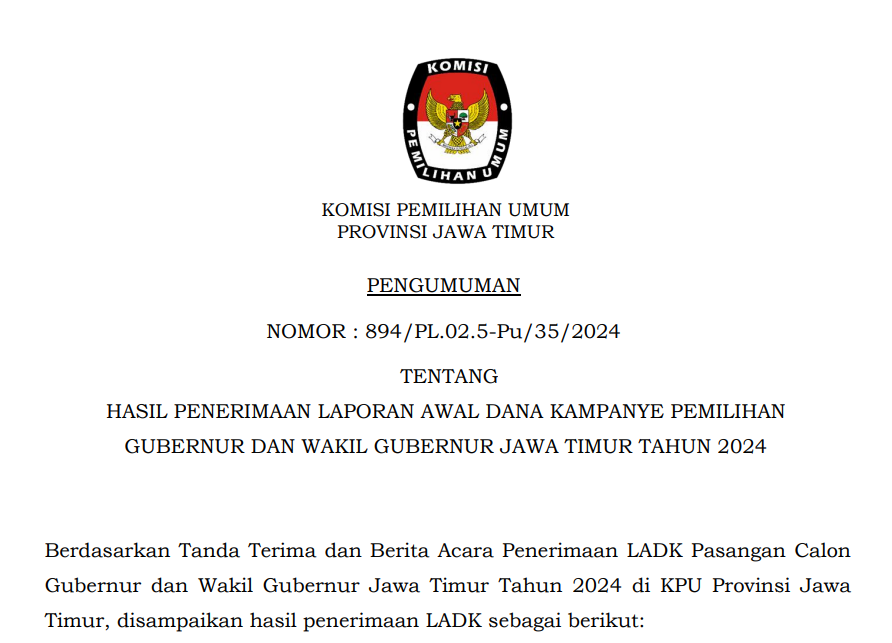 Pengumuman Nomor 894/PL.02.5-Pu/35/2024 Tentang Hasil Penerimaan Laporan Awal Dana Kampanye (LADK) Pemilihan Gubernur dan Wakil Gubernur Jawa Timur Tahun 2024 Unduh di Sini