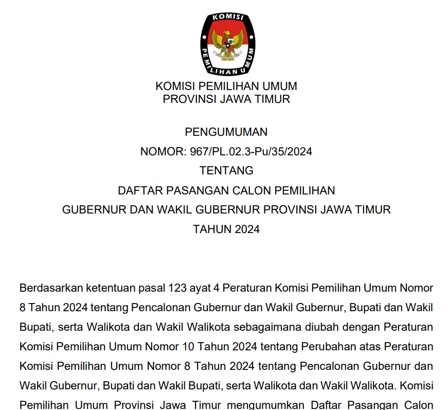 Berikut disampaikan Pengumuman Nomor: 967/PL.02.3-Pu/35/2024 Tentang Daftar Pasangan Calon Pemilihan Gubernur dan Wakil Gubernur Provinsi Jawa Timur Tahun 2024 Unduh di Sini