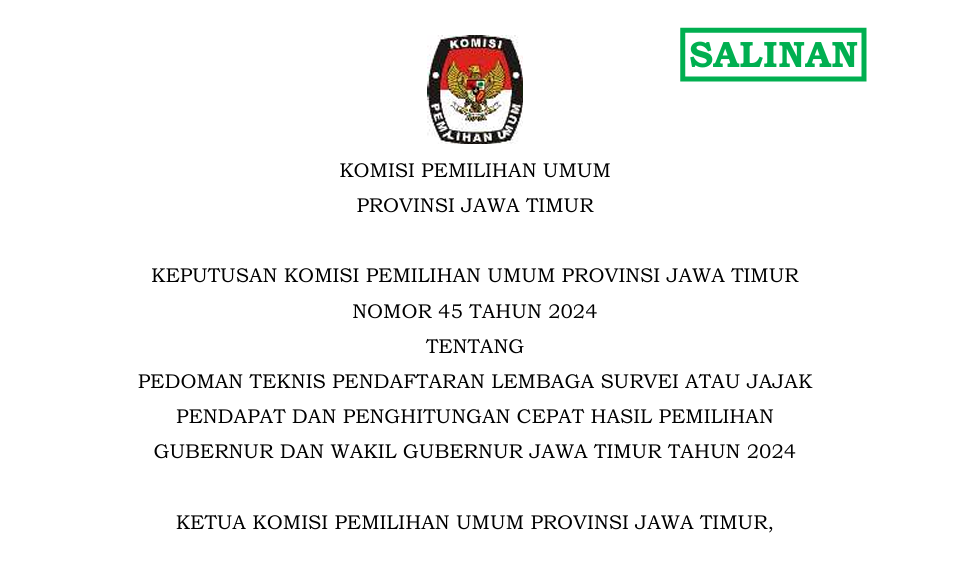 Pengumuman Pendaftaran Lembaga Survei Atau Jajak Pendapat dan Penghitungan Cepat Hasil Pemilihan Gubernur dan Wakil Gubernur Jawa Timur Tahun 2024 Klik di Sini