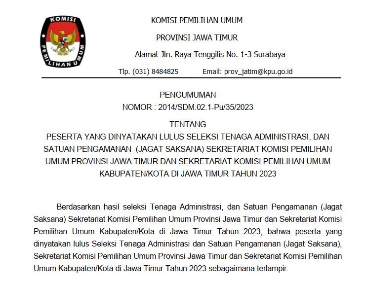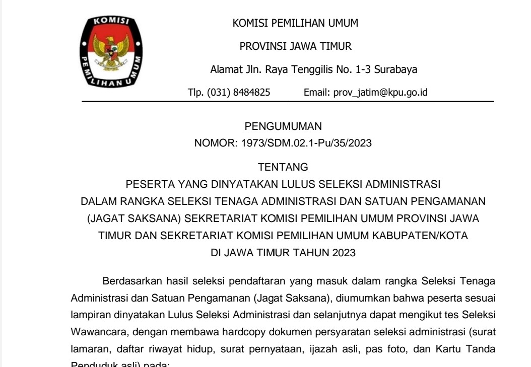 Berikut disampaikan Pengumuman Peserta yang Dinyatakan Lulus Seleksi Administrasi Dalam Seleksi Tenaga Administrasi dan Jagatsaksana Sekretariat KPU Provinsi Jawa Timur dan KPU Kabupaten/Kota di Jawa Timur Tahun 2023 Unduh di Sini