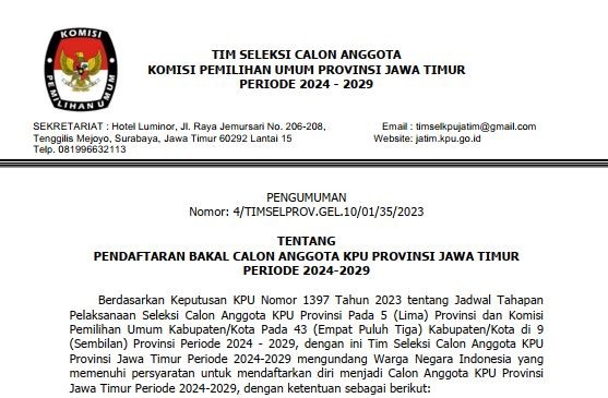 #TemanPemilih, berikut disampaikan Pengumuman Nomor : 4/TIMSELPROV.GEL.10/01/35/2023 Tentang Pendaftaran Bakal Calon Anggota KPU Provinsi Jawa Timur Periode 2024 - 2029. Silahkan Unduh di sini