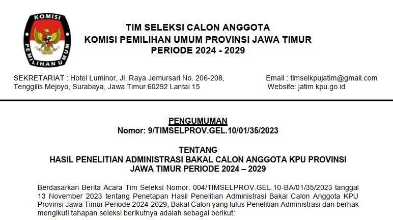 Berikut ini disampaikan Pengumuman Nomor: 9/TIMSELPROV.GEL.10/01/35/2023 Tentang Hasil Penelitian Administrasi Bakal Calon Anggota KPU Provinsi Jawa Timur Periode 2024-2029. Silahkan Unduh di Sini