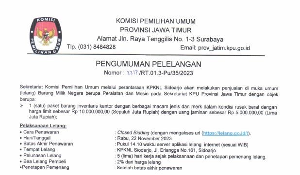 Berikut disampaikan pengumuman pelelangan Nomor: 2217/RT.01.3-Pu/35/2023 terkait dengan lelang Barang Miliki Negara berupa peralatan dan mesin pada Sekretariat KPU Provinsi Jawa Timur dengan rincian sebagaimana pengumuman berikut, Unduh di Sini